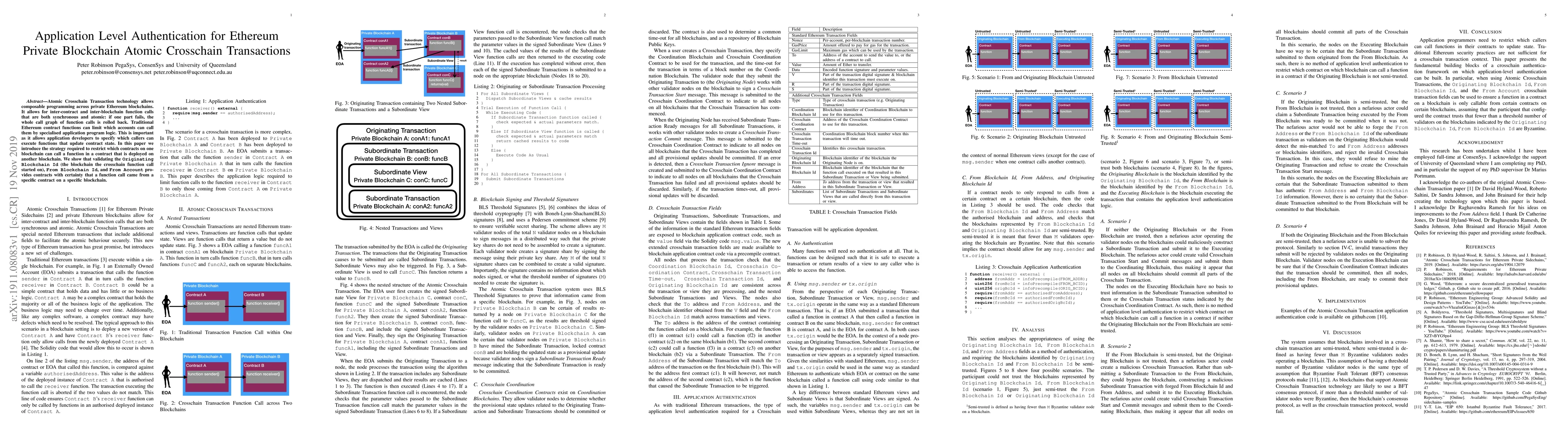 This paper proposes a strategy for application level authentication in Ethereum private blockchains to secure atomic crosschain transactions. It introduces a method to restrict crosschain function calls by validating the originating blockchain ID, from blockchain ID, and from account, ensuring the authenticity of contract calls across different blockchains.