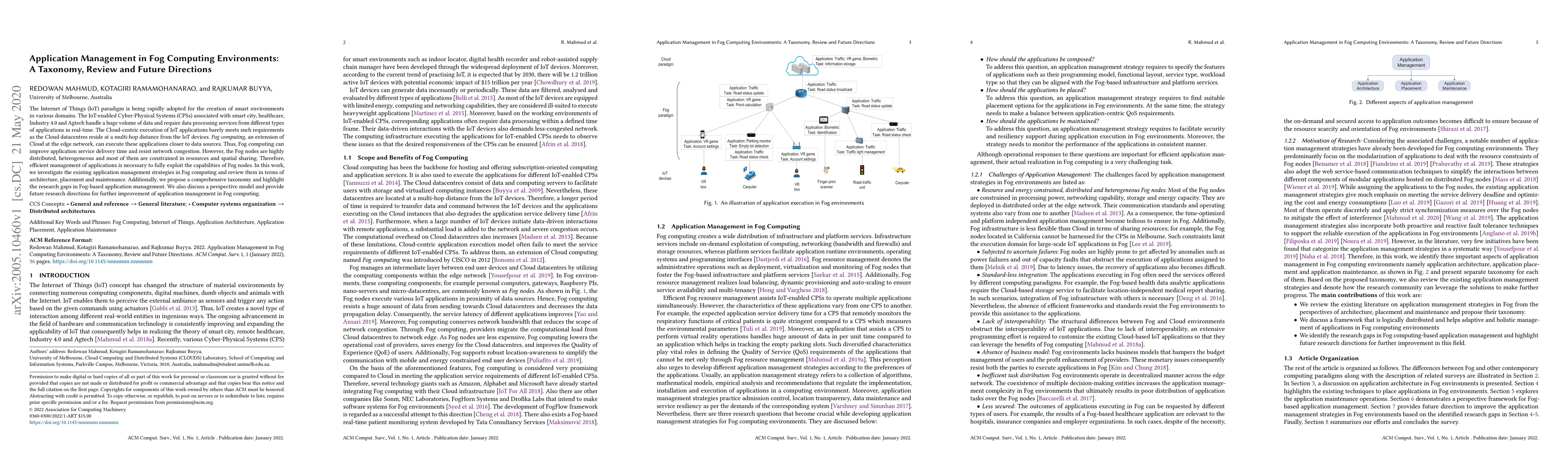 The Internet of Things (IoT) paradigm is being rapidly adopted for the creation of smart environments in various domains. The IoT-enabled Cyber-Physical Systems (CPSs) associated with smart city, healthcare, Industry 4.0 and Agtech handle a huge volume of data and require data processing services from different types of applications in real-time. The Cloud-centric execution of IoT applications barely meets such requirements as the Cloud datacentres reside at a multi-hop distance from the IoT devices. \textit{Fog computing}, an extension of Cloud at the edge network, can execute these applications closer to data sources. Thus, Fog computing can improve application service delivery time and resist network congestion. However, the Fog nodes are highly distributed, heterogeneous and most of them are constrained in resources and spatial sharing. Therefore, efficient management of applications is necessary to fully exploit the capabilities of Fog nodes. In this work, we investigate the existing application management strategies in Fog computing and review them in terms of architecture, placement and maintenance. Additionally, we propose a comprehensive taxonomy and highlight the research gaps in Fog-based application management. We also discuss a perspective model and provide future research directions for further improvement of application management in Fog computing.