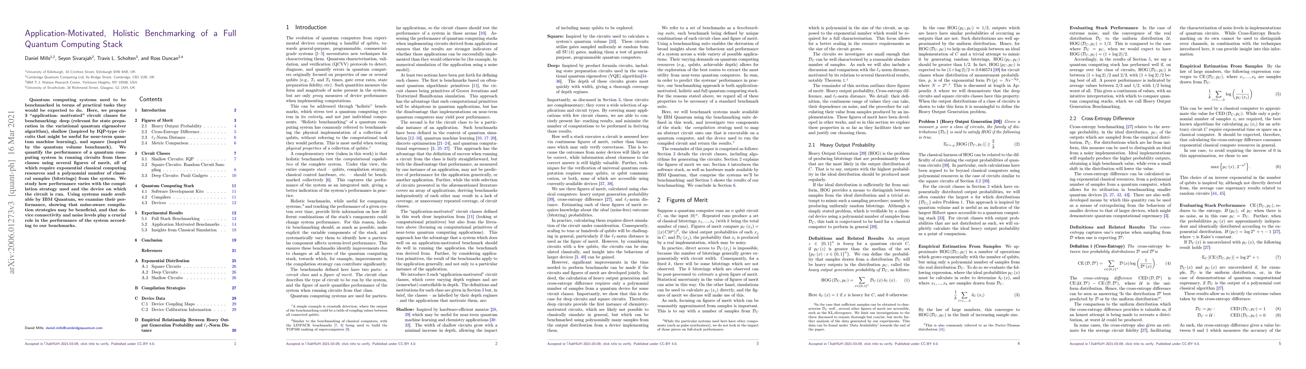 This paper proposes three "application-motivated" circuit classes for benchmarking quantum computing systems: deep, shallow, and square. It evaluates the performance of these circuits using various figures of merit, highlighting the impact of compilation strategies and device characteristics on outcomes.
