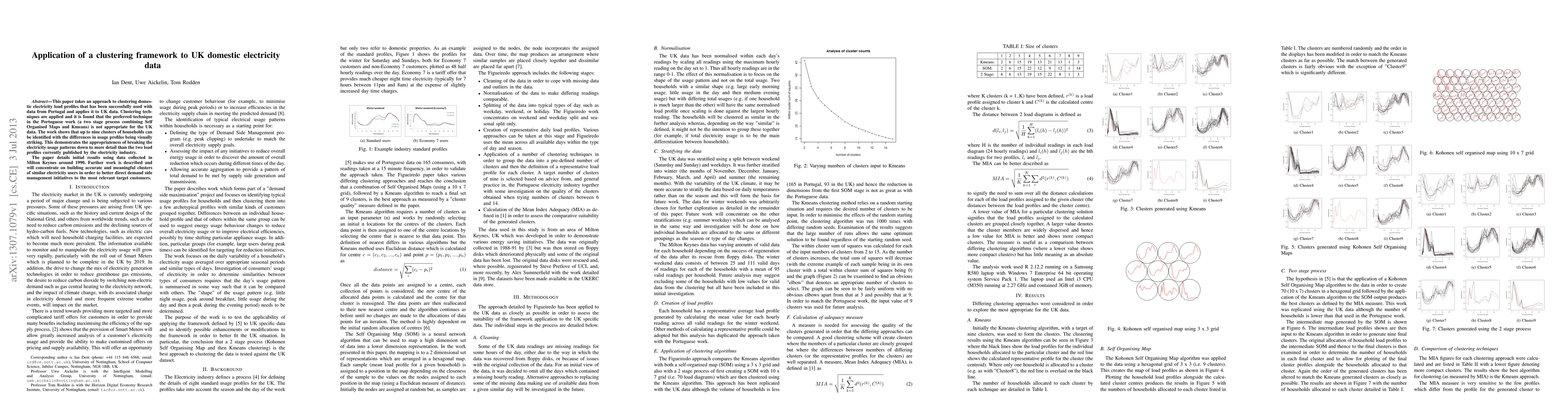 This paper applies a clustering framework to UK domestic electricity data, finding that a two-stage process combining Self Organised Maps and Kmeans, effective for Portuguese data, is unsuitable for UK data. The study identifies up to nine distinct clusters of households, highlighting the potential for more detailed electricity usage analysis beyond current industry profiles.