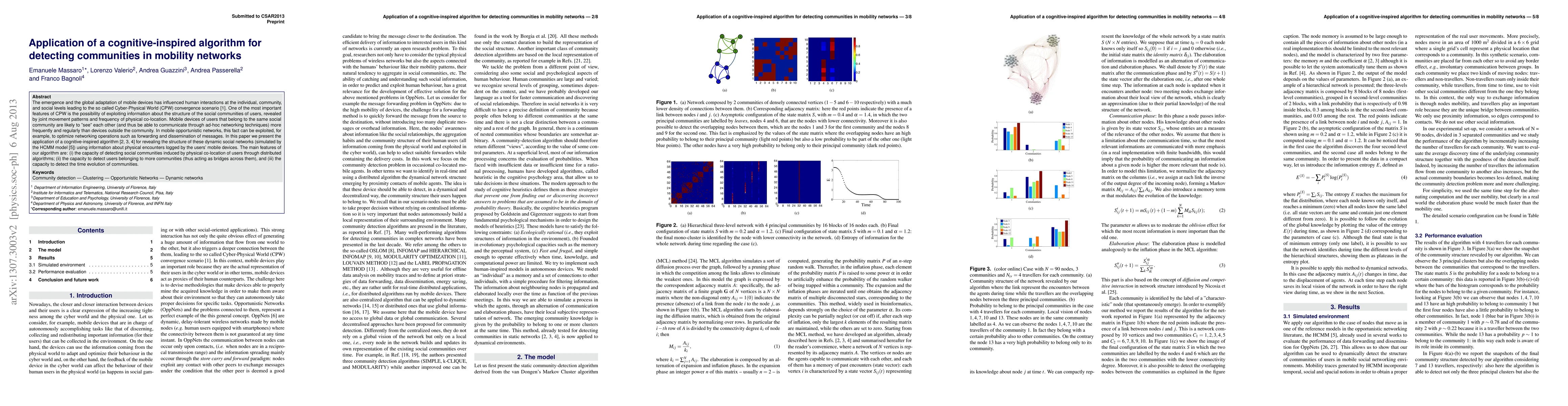 The emergence and the global adaptation of mobile devices has influenced human interactions at the individual, community, and social levels leading to the so called Cyber-Physical World (CPW) convergence scenario [1]. One of the most important features of CPW is the possibility of exploiting information about the structure of the social communities of users, revealed by joint movement patterns and frequency of physical co-location. Mobile devices of users that belong to the same social community are likely to "see" each other (and thus be able to communicate through ad-hoc networking techniques) more frequently and regularly than devices outside the community. In mobile opportunistic networks, this fact can be exploited, for example, to optimize networking operations such as forwarding and dissemination of messages. In this paper we present the application of a cognitive-inspired algorithm [2,3,4] for revealing the structure of these dynamic social networks (simulated by the HCMM model [5]) using information about physical encounters logged by the users' mobile devices. The main features of our algorithm are: (i) the capacity of detecting social communities induced by physical co-location of users through distributed algorithms; (ii) the capacity to detect users belonging to more communities (thus acting as bridges across them), and (iii) the capacity to detect the time evolution of communities.