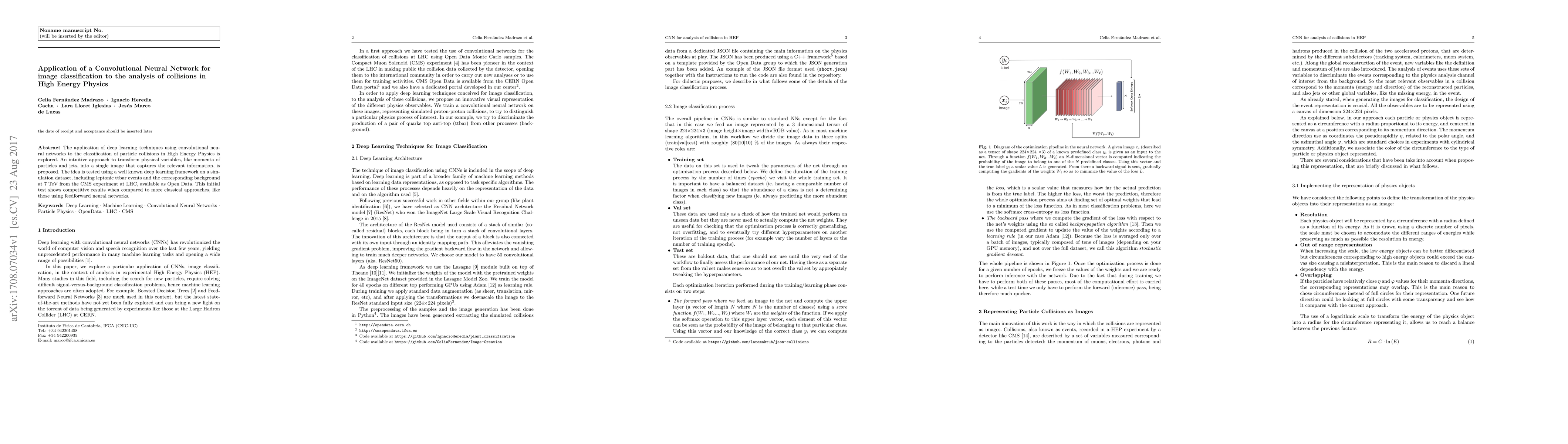 This paper explores using convolutional neural networks for classifying particle collisions in High Energy Physics, transforming physical variables into images for analysis. Initial tests on a CMS experiment dataset show competitive results compared to traditional feedforward neural networks.