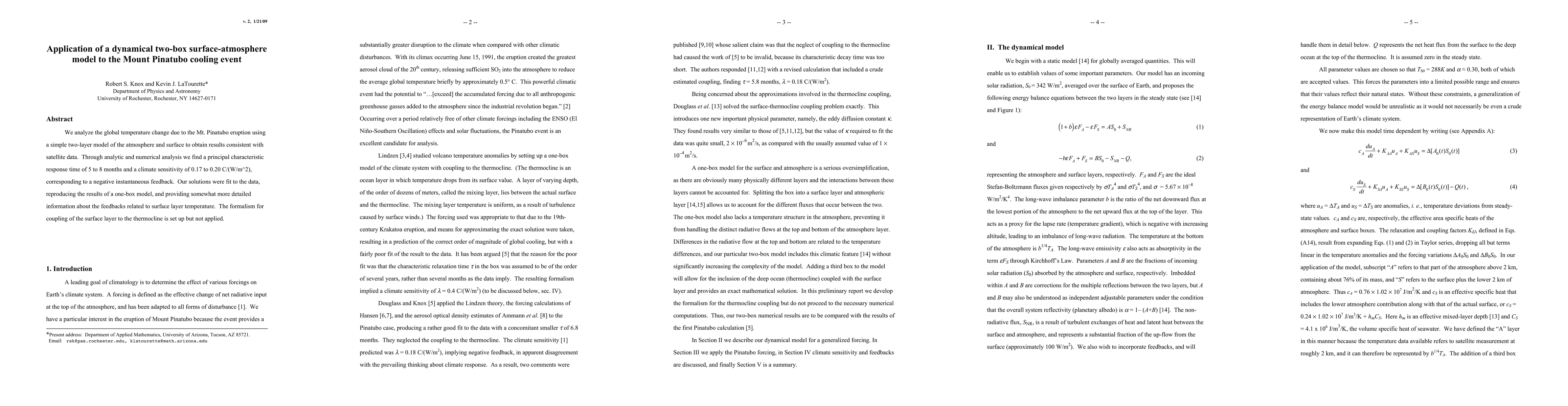 The study uses a two-box surface-atmosphere model to analyze the global temperature change due to the Mt. Pinatubo eruption, finding a principal characteristic response time of 5-8 months and a climate sensitivity of 0.17-0.20 C/(W/m^2).