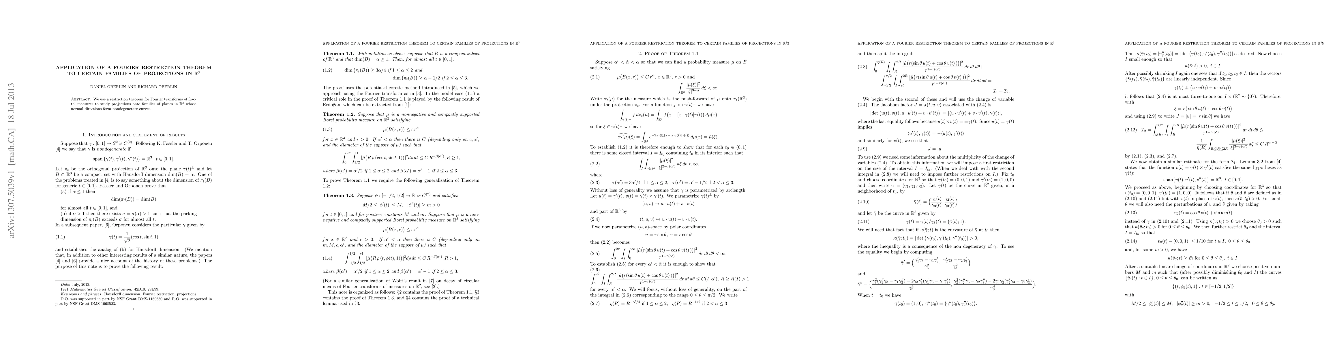 Summary: This paper applies a Fourier restriction theorem to analyze fractal measure projections onto families of planes in R^3, focusing on normal directions that form nondegenerate curves. The study provides insights into the behavior of these projections.
