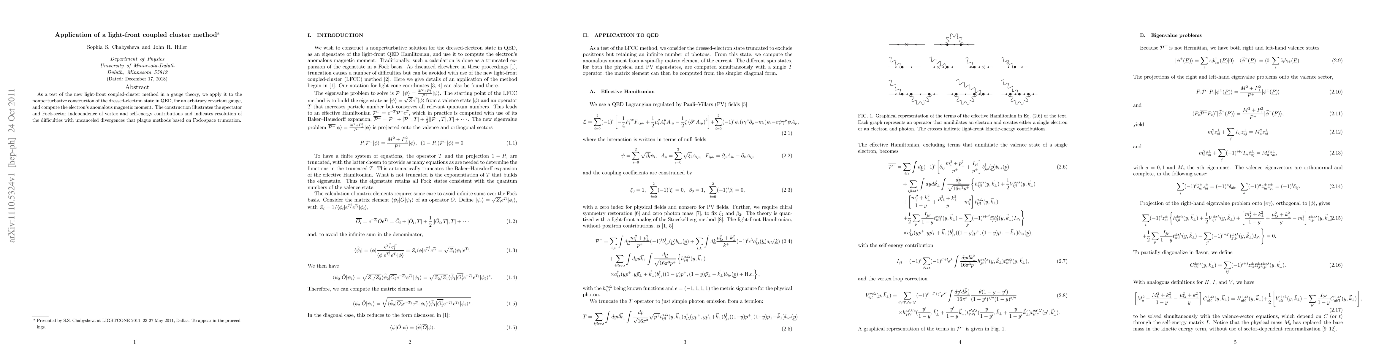 This paper tests a new light-front coupled-cluster method by applying it to construct the dressed-electron state in QED, computing the electron's anomalous magnetic moment, and demonstrating its resolution of divergence issues compared to traditional Fock-space methods.