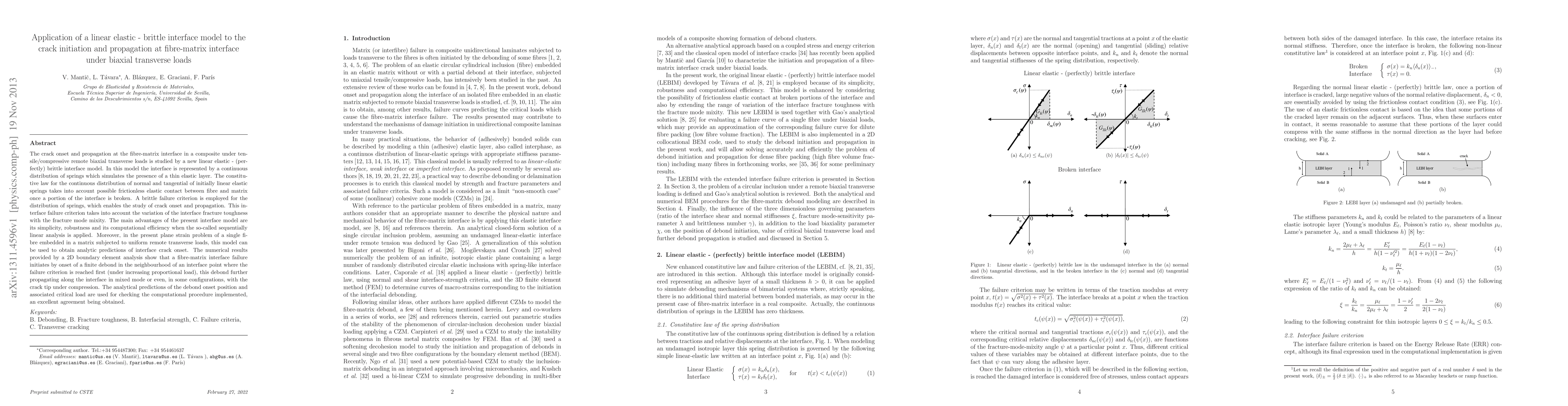 This paper introduces a linear elastic-brittle interface model to study crack initiation and propagation at the fibre-matrix interface under biaxial transverse loads. The model uses springs to simulate an elastic layer and predicts interface crack onset and propagation with computational efficiency, showing good agreement between analytical predictions and numerical results.