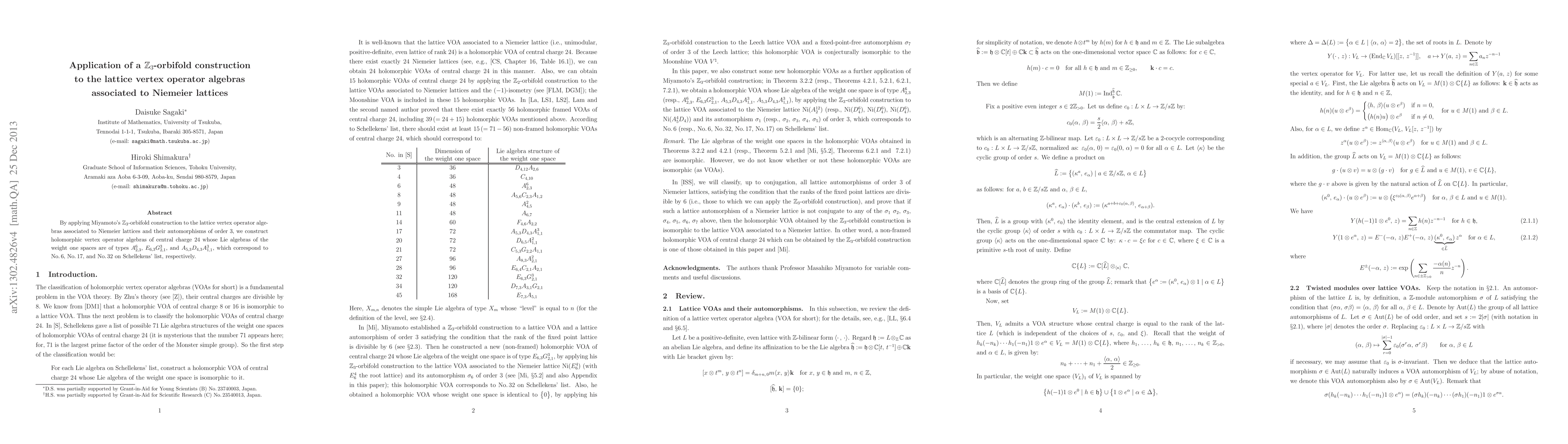 This paper constructs holomorphic vertex operator algebras of central charge 24 using Miyamoto's $\mathbb{Z}_{3}$-orbifold method applied to Niemeier lattices, resulting in Lie algebras of types $A_{2,3}^6$, $E_{6,3}G_{2,1}^{3}$, and $A_{5,3}D_{4,3}A_{1,1}^{3}$. These correspond to specific entries on Schellekens' classification list.