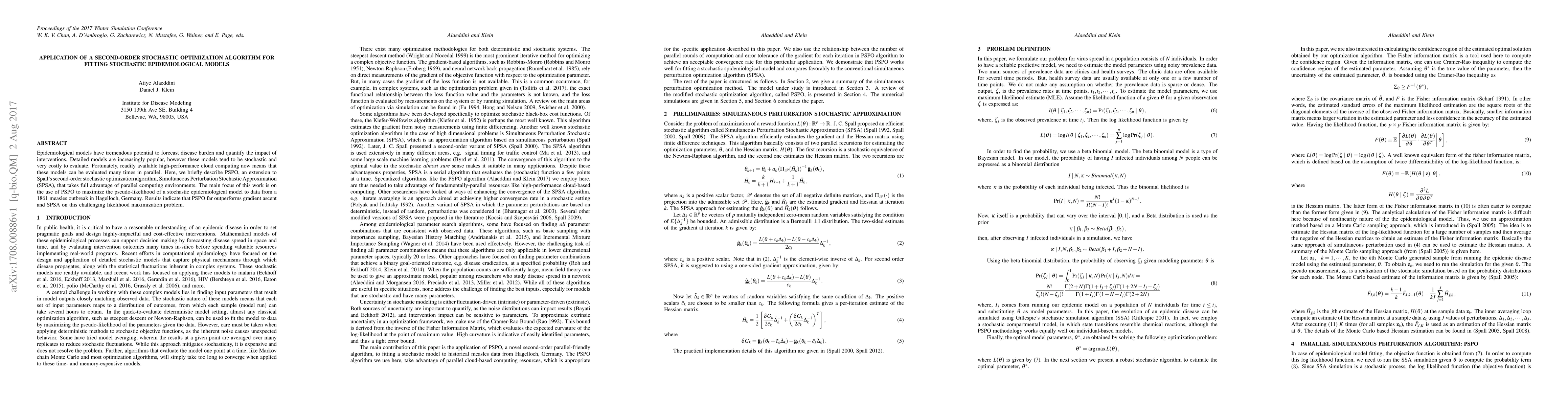 Epidemiological models have tremendous potential to forecast disease burden and quantify the impact of interventions. Detailed models are increasingly popular, however these models tend to be stochastic and very costly to evaluate. Fortunately, readily available high-performance cloud computing now means that these models can be evaluated many times in parallel. Here, we briefly describe PSPO, an extension to Spall's second-order stochastic optimization algorithm, Simultaneous Perturbation Stochastic Approximation (SPSA), that takes full advantage of parallel computing environments. The main focus of this work is on the use of PSPO to maximize the pseudo-likelihood of a stochastic epidemiological model to data from a 1861 measles outbreak in Hagelloch, Germany. Results indicate that PSPO far outperforms gradient ascent and SPSA on this challenging likelihood maximization problem.