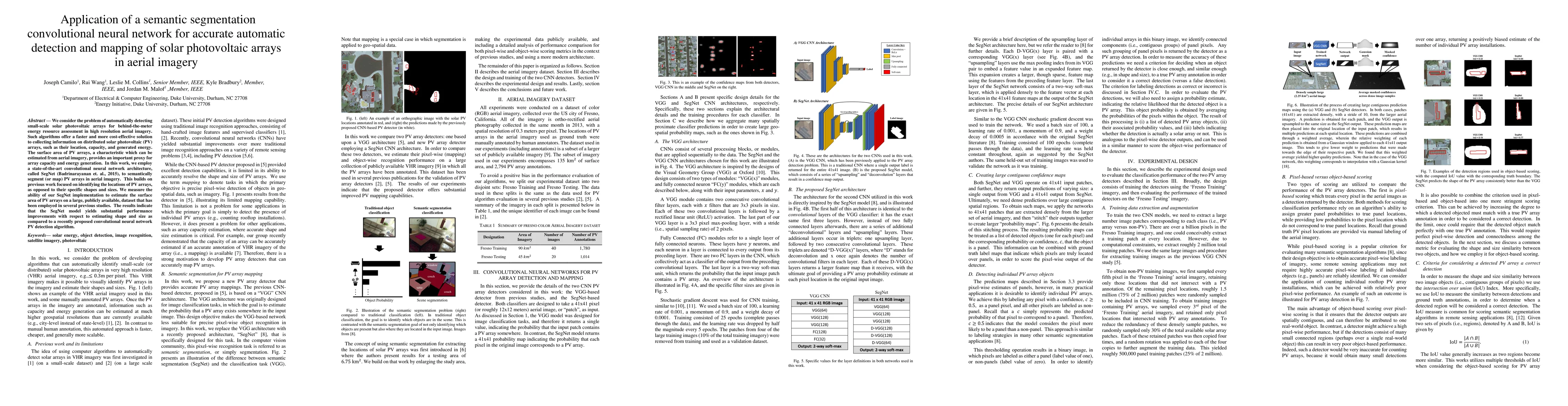 This paper applies a SegNet convolutional neural network for semantic segmentation to accurately detect and map small-scale solar photovoltaic arrays in high-resolution aerial imagery, significantly improving the estimation of array surface area compared to previous methods. The results demonstrate the potential of this approach for cost-effective assessment of distributed solar PV resources.