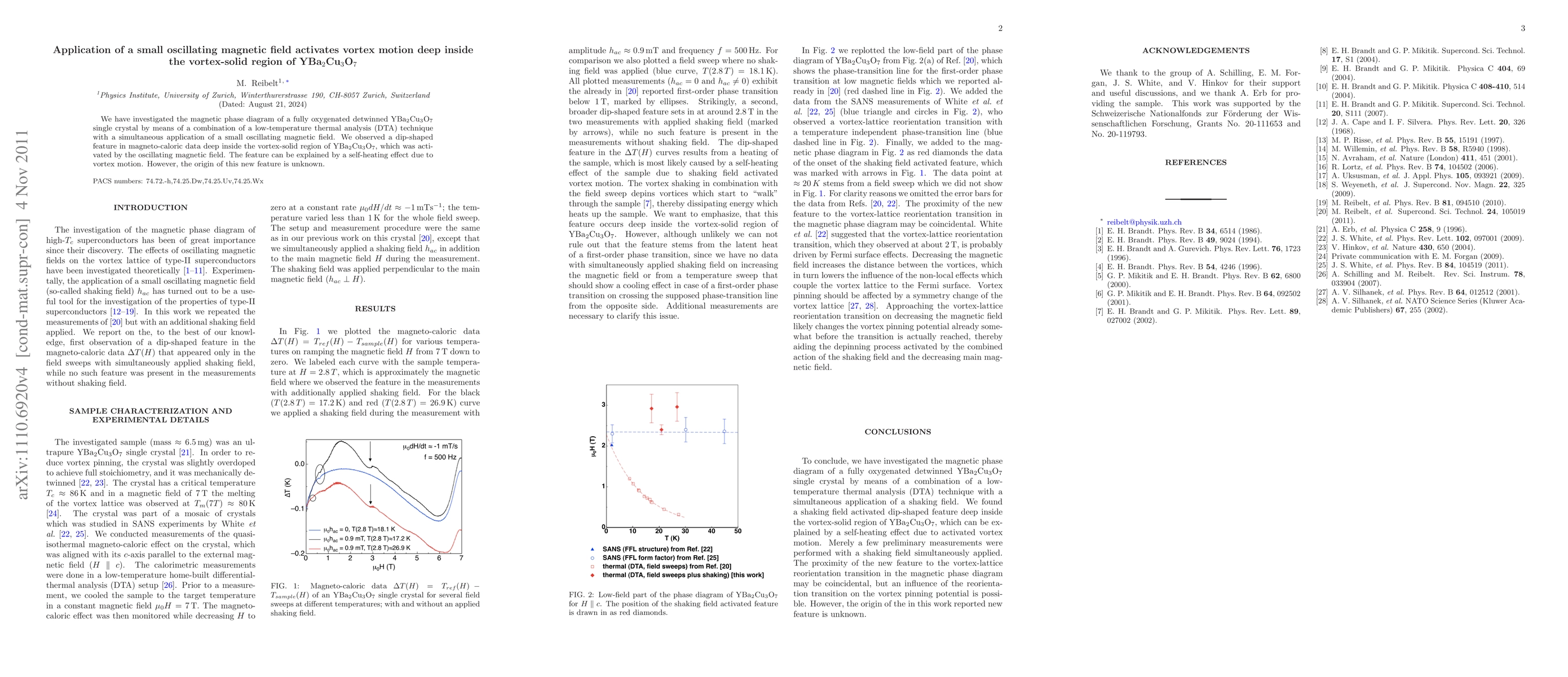We have investigated the magnetic phase diagram of a fully oxygenated detwinned YBa2Cu3O7 single crystal by means of a combination of a low-temperature thermal analysis (DTA) technique with a simultaneous application of a small oscillating magnetic field. We observed a dip-shaped feature in magneto-caloric data deep inside the vortex-solid region of YBa2Cu3O7, which was activated by the oscillating magnetic field. The feature can be explained by a self-heating effect due to vortex motion. However, the origin of this new feature is unknown.