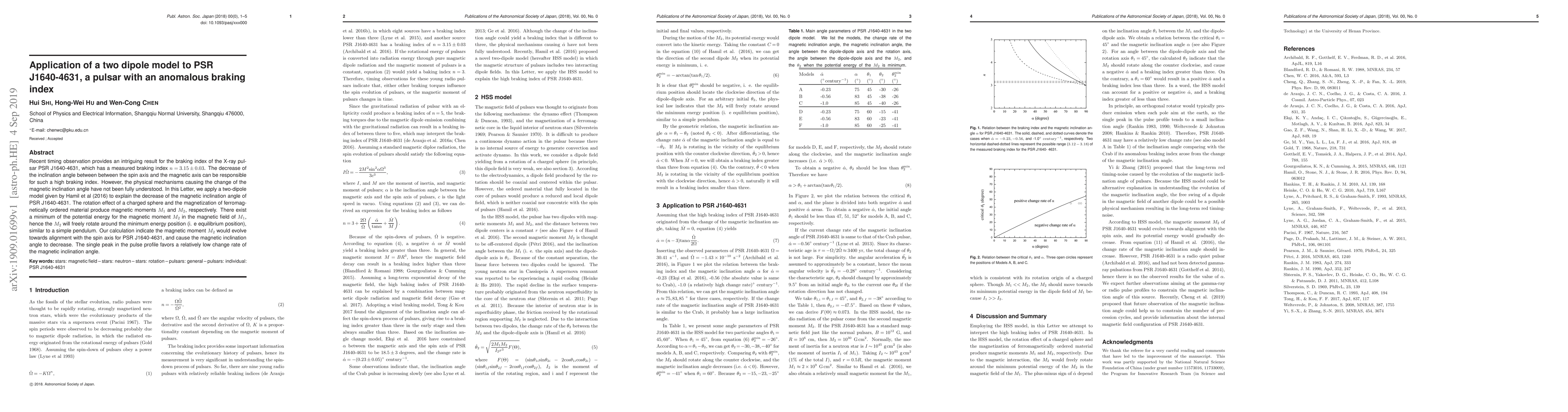 This paper applies a two-dipole model to explain the anomalous braking index of PSR J1640-4631, suggesting that the rotation effect of a charged sphere and magnetization of ferromagnetic material can lead to a decrease in magnetic inclination angle. The model predicts that the magnetic moment will align with the spin axis, causing the observed high braking index.