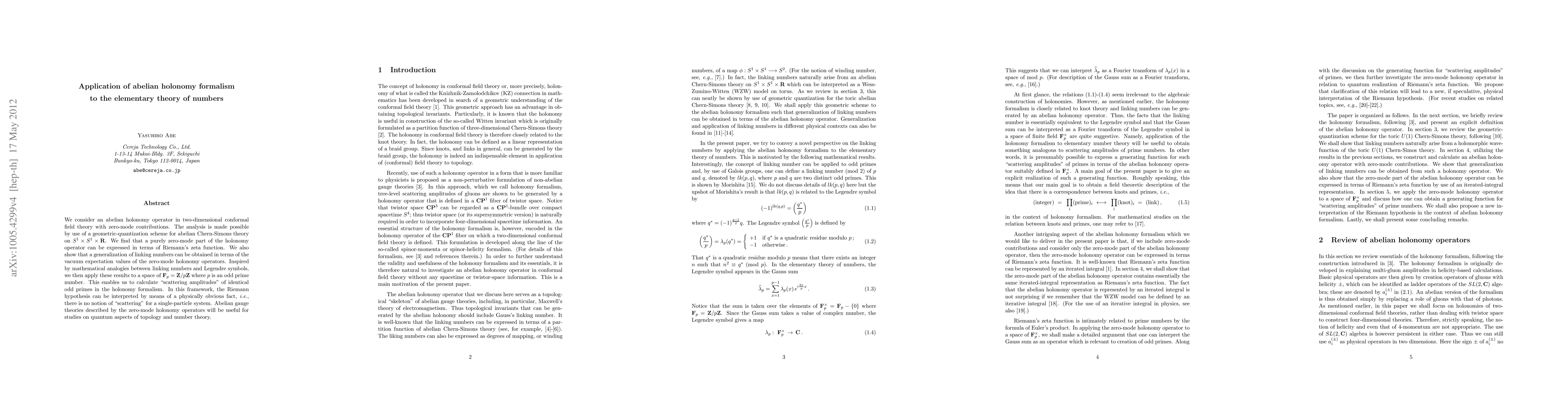 We consider an abelian holonomy operator in two-dimensional conformal field theory with zero-mode contributions. The analysis is made possible by use of a geometric-quantization scheme for abelian Chern-Simons theory on $S^1 \times S^1 \times {\bf R}$. We find that a purely zero-mode part of the holonomy operator can be expressed in terms of Riemann's zeta function. We also show that a generalization of linking numbers can be obtained in terms of the vacuum expectation values of the zero-mode holonomy operators. Inspired by mathematical analogies between linking numbers and Legendre symbols, we then apply these results to a space of ${\bf F}_p = {\bf Z}/ p {\bf Z}$ where $p$ is an odd prime number. This enables us to calculate "scattering amplitudes" of identical odd primes in the holonomy formalism. In this framework, the Riemann hypothesis can be interpreted by means of a physically obvious fact, i.e., there is no notion of "scattering" for a single-particle system. Abelian gauge theories described by the zero-mode holonomy operators will be useful for studies on quantum aspects of topology and number theory.