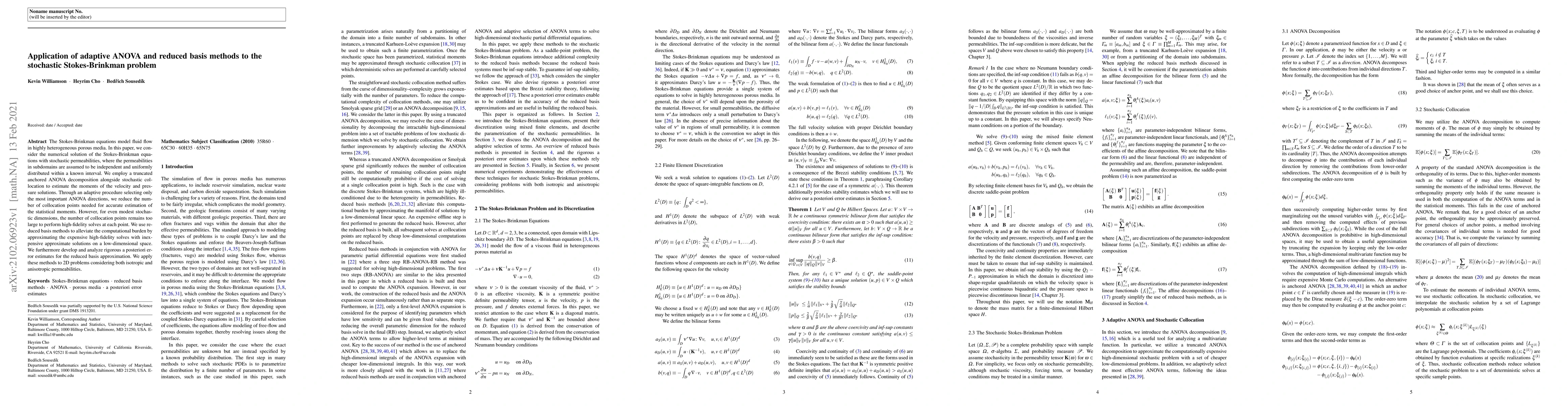 This paper applies adaptive ANOVA and reduced basis methods to solve the stochastic Stokes-Brinkman equations with random permeabilities. It uses truncated anchored ANOVA and stochastic collocation to estimate statistical moments and employs reduced basis methods to efficiently handle high-fidelity solves in high-dimensional stochastic spaces.