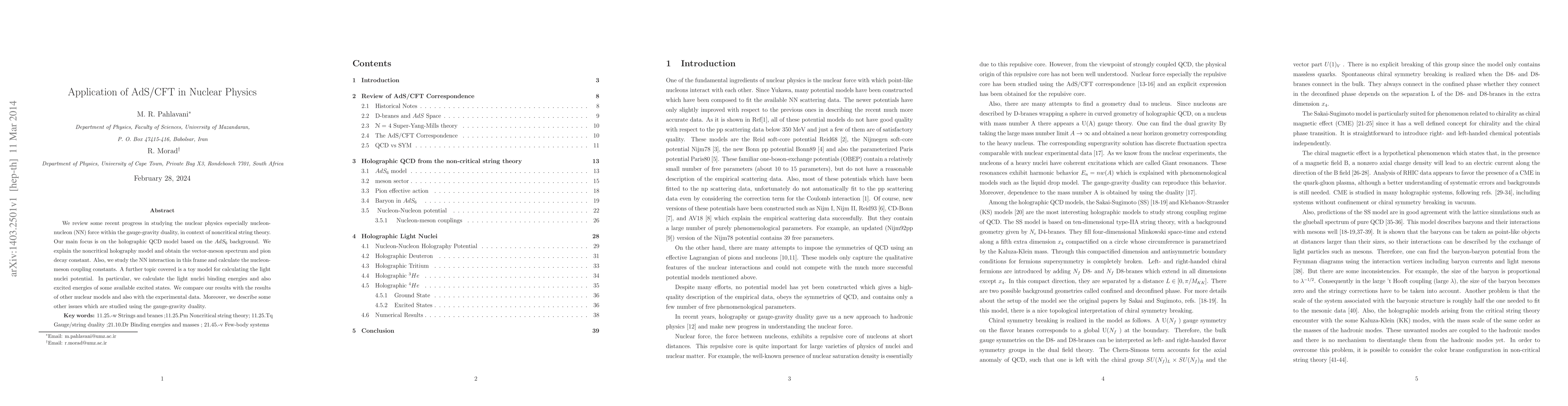 We review some recent progress in studying the nuclear physics especially nucleon-nucleon (NN) force within the gauge-gravity duality, in context of noncritical string theory. Our main focus is on the holographic QCD model based on the $AdS_6$ background. We explain the noncritical holography model and obtain the vector-meson spectrum and pion decay constant. Also, we study the NN interaction in this frame and calculate the nucleon-meson coupling constants. A further topic covered is a toy model for calculating the light nuclei potential. In particular, we calculate the light nuclei binding energies and also excited energies of some available excited states. We compare our results with the results of other nuclear models and also with the experimental data. Moreover, we describe some other issues which are studied using the gauge-gravity duality.