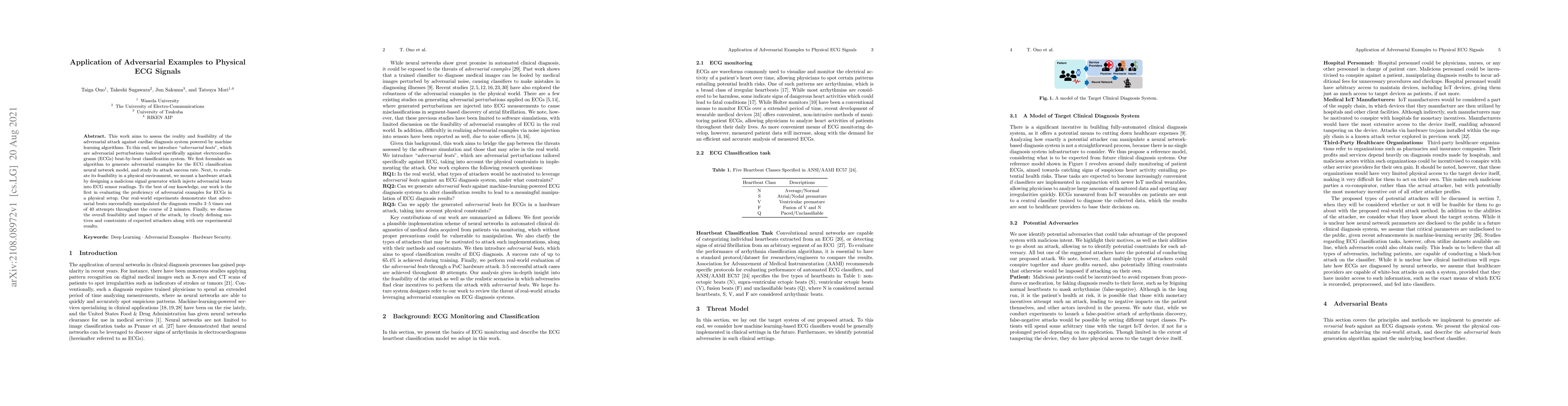 This work aims to assess the reality and feasibility of the adversarial attack against cardiac diagnosis system powered by machine learning algorithms. To this end, we introduce adversarial beats, which are adversarial perturbations tailored specifically against electrocardiograms (ECGs) beat-by-beat classification system. We first formulate an algorithm to generate adversarial examples for the ECG classification neural network model, and study its attack success rate. Next, to evaluate its feasibility in a physical environment, we mount a hardware attack by designing a malicious signal generator which injects adversarial beats into ECG sensor readings. To the best of our knowledge, our work is the first in evaluating the proficiency of adversarial examples for ECGs in a physical setup. Our real-world experiments demonstrate that adversarial beats successfully manipulated the diagnosis results 3-5 times out of 40 attempts throughout the course of 2 minutes. Finally, we discuss the overall feasibility and impact of the attack, by clearly defining motives and constraints of expected attackers along with our experimental results.