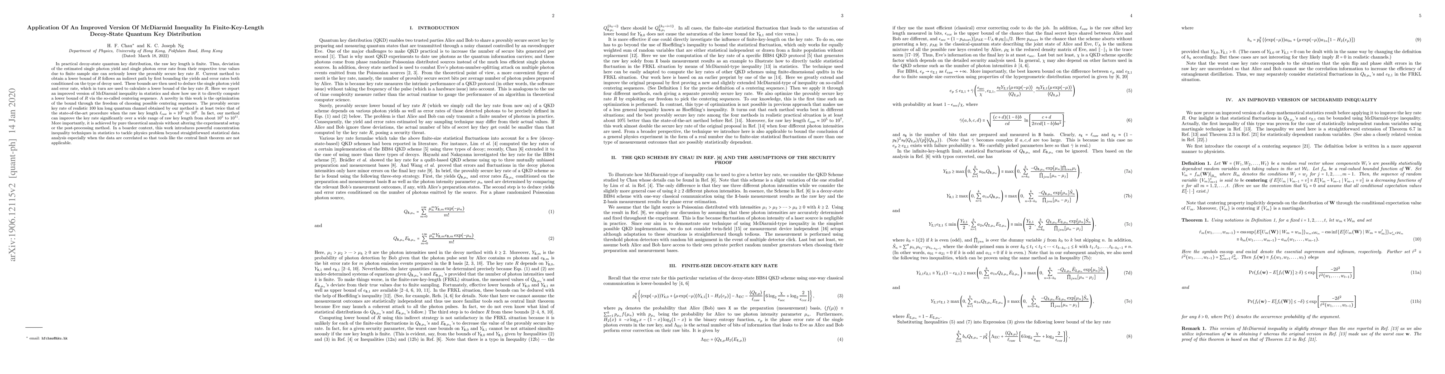In practical decoy-state quantum key distribution, the raw key length is finite. Thus, deviation of the estimated single photon yield and single photon error rate from their respective true values due to finite sample size can seriously lower the provably secure key rate $R$. Current method to obtain a lower bound of $R$ follows an indirect path by first bounding the yields and error rates both conditioned on the type of decoy used. These bounds are then used to deduce the single photon yield and error rate, which in turn are used to calculate a lower bound of the key rate $R$. Here we report an improved version of McDiarmid inequality in statistics and show how use it to directly compute a lower bound of $R$ via the so-called centering sequence. A novelty in this work is the optimization of the bound through the freedom of choosing possible centering sequences. The provably secure key rate of realistic 100~km long quantum channel obtained by our method is at least twice that of the state-of-the-art procedure when the raw key length $\ell_\text{raw}$ is $\approx 10^5$ to $10^6$. In fact, our method can improve the key rate significantly over a wide range of raw key length from about $10^5$ to $10^{11}$. More importantly, it is achieved by pure theoretical analysis without altering the experimental setup or the post-processing method. In a boarder context, this work introduces powerful concentration inequality techniques in statistics to tackle physics problem beyond straightforward statistical data analysis especially when the data are correlated so that tools like the central limit theorem are not applicable.