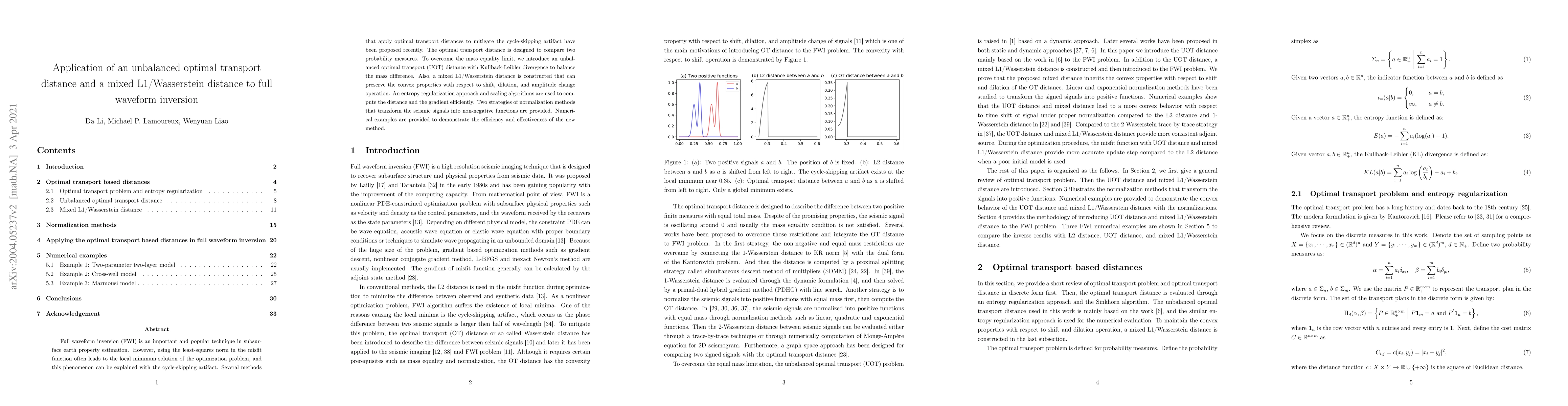 This paper proposes an unbalanced optimal transport distance and a mixed L1/Wasserstein distance to improve full waveform inversion (FWI) by mitigating cycle-skipping artifacts. The new methods incorporate entropy regularization and scaling algorithms for efficient computation and demonstrate improved performance through numerical examples.