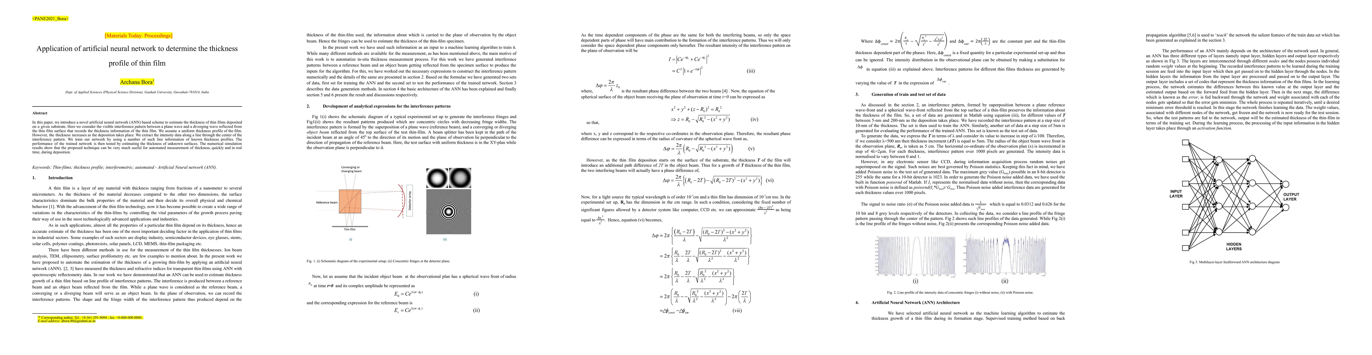 In this paper, we introduce a novel artificial neural network (ANN) based scheme to estimate the thickness of thin films deposited on a given substrate. Here we consider the visible interference pattern between a plane wave and a diverging wave reflected from the thin film surface that records the thickness information of the thin film. We assume a uniform thickness profile of the film. However, the thickness increases as the deposition takes place. We extract the intensity data along a line through the center of the interference pattern. We train our network by using a number of such line information of known thickness profiles. The performance of the trained network is then tested by estimating the thickness of unknown surfaces. The numerical simulation results show that the proposed technique can be very much useful for automated measurement of thickness, quickly and in real time, during deposition
