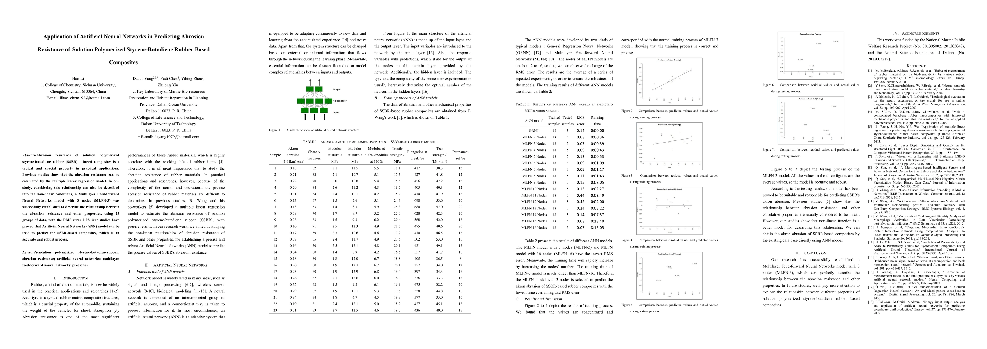 Abrasion resistance of solution polymerized styrene-butadiene rubber (SSBR) based composites is a typical and crucial property in practical applications. Previous studies show that the abrasion resistance can be calculated by the multiple linear regression model. In our study, considering this relationship can also be described into the non-linear conditions, a Multilayer Feed-forward Neural Networks model with 3 nodes (MLFN-3) was successfully established to describe the relationship between the abrasion resistance and other properties, using 23 groups of data, with the RMS error 0.07. Our studies have proved that Artificial Neural Networks (ANN) model can be used to predict the SSBR-based composites, which is an accurate and robust process.