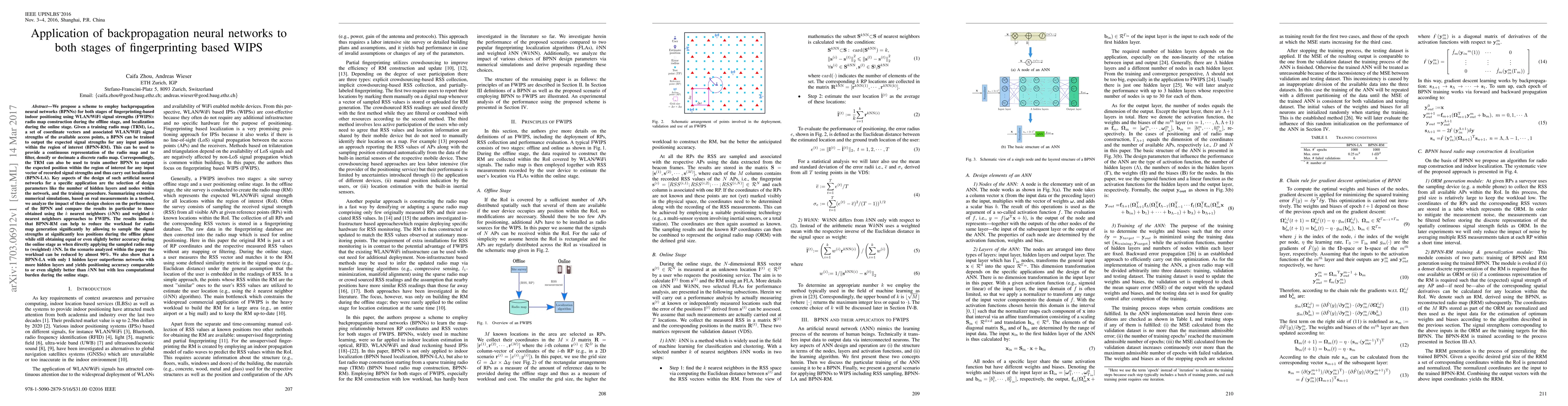 This paper proposes using backpropagation neural networks (BPNNs) for both radio map construction and localization in fingerprinting-based indoor positioning using WLAN/WiFi signals. It analyzes the impact of BPNN design parameters on performance and compares results to $k$NN and weighted $k$NN methods.