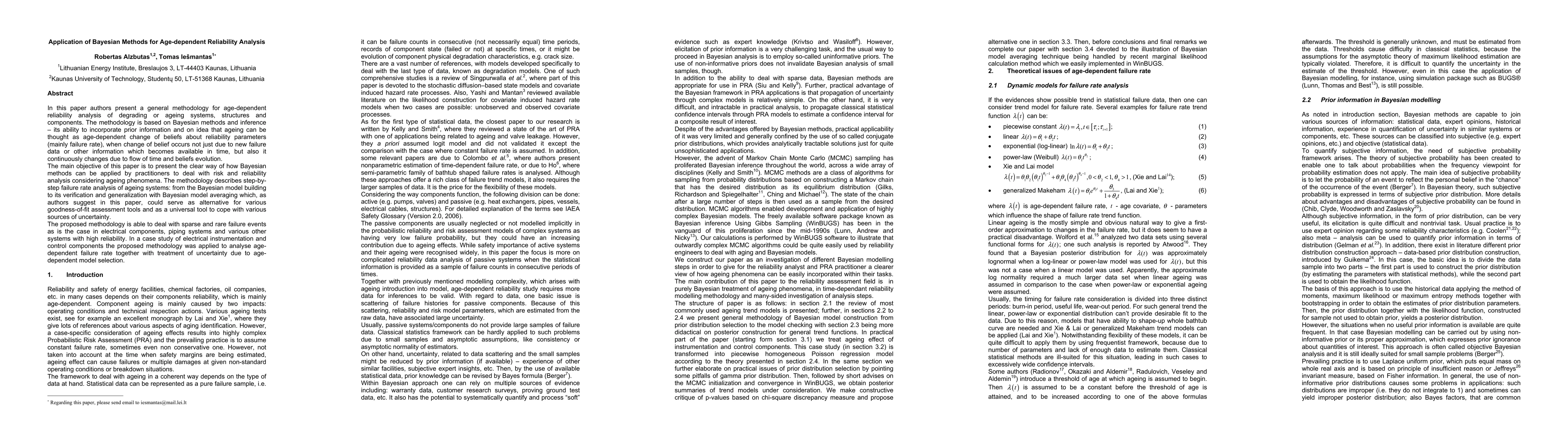In this paper authors present a general methodology for age dependent reliability analysis of degrading or ageing systems, structures and components.The methodology is based on Bayesian methods and inference, its ability to incorporate prior information and on idea that ageing can be thought as age dependent change of believes about reliability parameters, when change of belief occurs not just due to new failure data or other information which becomes available in time, but also it continuously changes due to flow of time and beliefs evolution. The main objective of this paper is to present the clear way of how Bayesian methods can be applied by practitioners to deal with risk and reliability analysis considering ageing phenomena. The methodology describes step by step failure rate analysis of ageing systems: from the Bayesian model building to its verification and generalization with Bayesian model averaging which, as authors suggest in this paper, could serve as alternative for various goodness of fit assessment tools and as universal tool to cope with various sources of uncertainty.