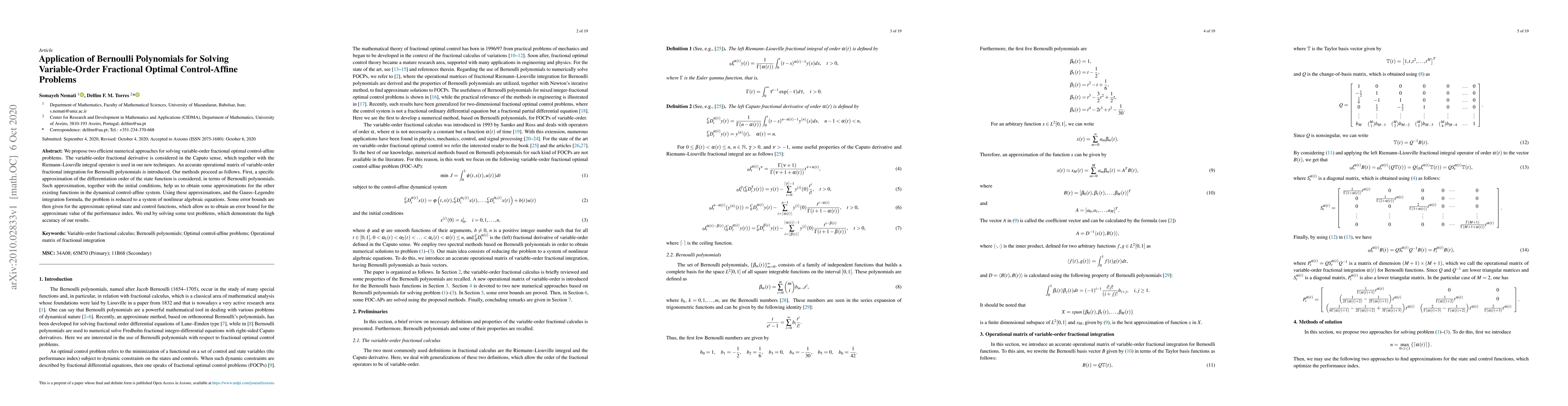 This paper proposes two numerical methods for solving variable-order fractional optimal control-affine problems using Bernoulli polynomials. The methods involve approximating the differentiation order with Bernoulli polynomials and reducing the problem to a system of nonlinear algebraic equations, demonstrating high accuracy through test problems.