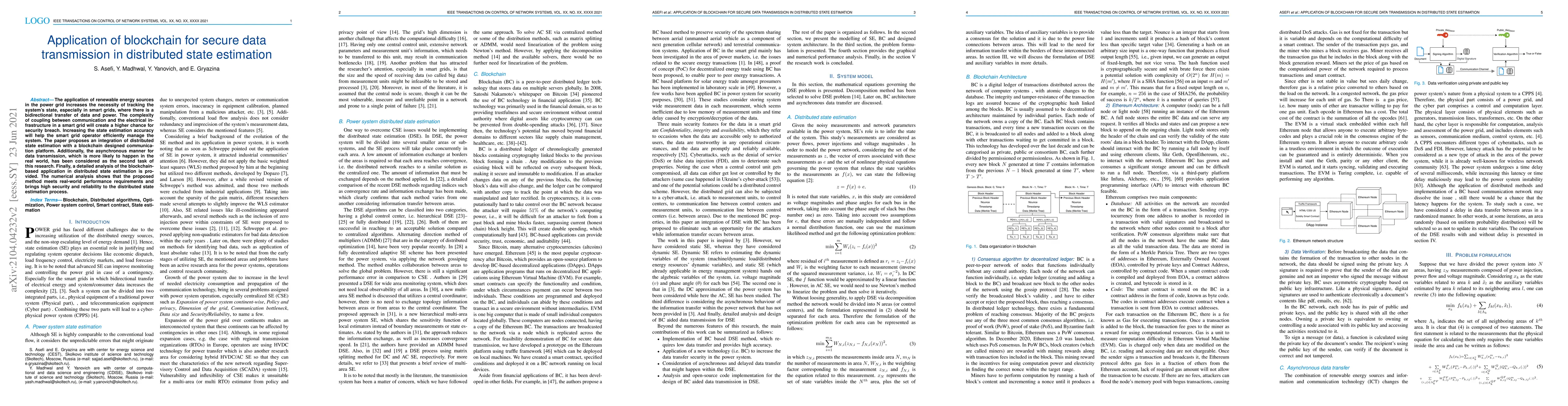 The application of renewable energy sources in the power grid increases the necessity of tracking the system's state, especially in smart grids, where there is a bidirectional transfer of data and power. The complexity of coupling between communication and the electrical infrastructure in a smart grid will create a higher chance for security breach. Increasing the state estimation accuracy will help the smart grid operator efficiently manage the system. The paper proposes an integration of distributed state estimation with a blockchain designed communication platform. Additionally, the asynchronous manner for data transmission, which is more likely to happen in the real world, has been considered as the second task of this research. Finally, a detailed analysis of the blockchain-based application in distributed state estimation is provided. The numerical analysis shows that the proposed method meets real-world performance requirements and brings high security and reliability to the distributed state estimation process.