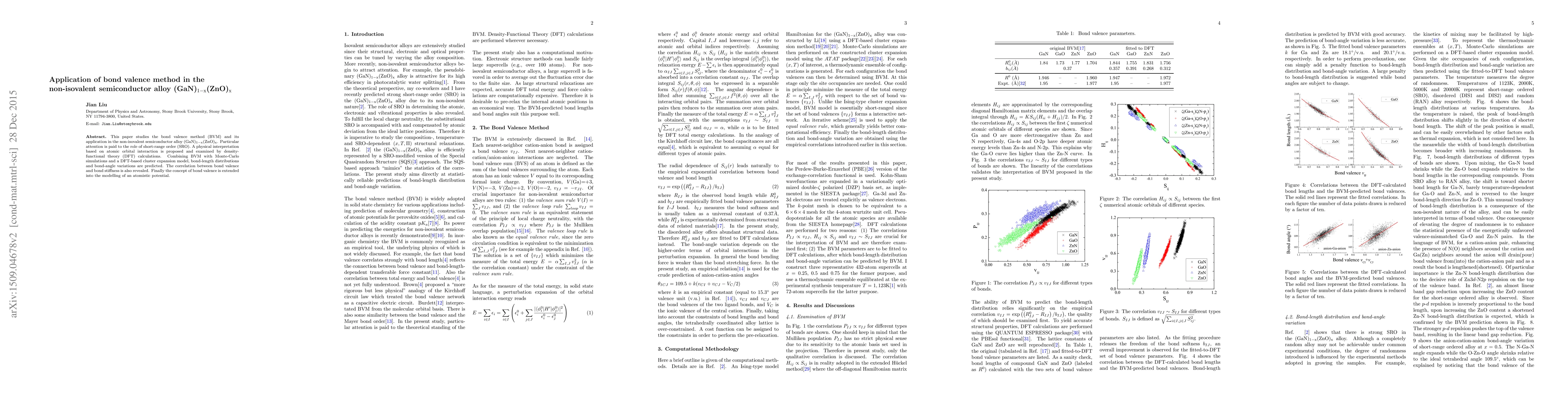 This paper applies the bond valence method (BVM) to analyze the non-isovalent semiconductor alloy (GaN)₁₋ₓ(ZnO)ₓ, focusing on short-range order and using DFT calculations to interpret atomic orbital interactions. It combines BVM with simulations and a DFT-based model to predict bond-length distributions and bond-angle variations, revealing the correlation between bond valence and bond stiffness.