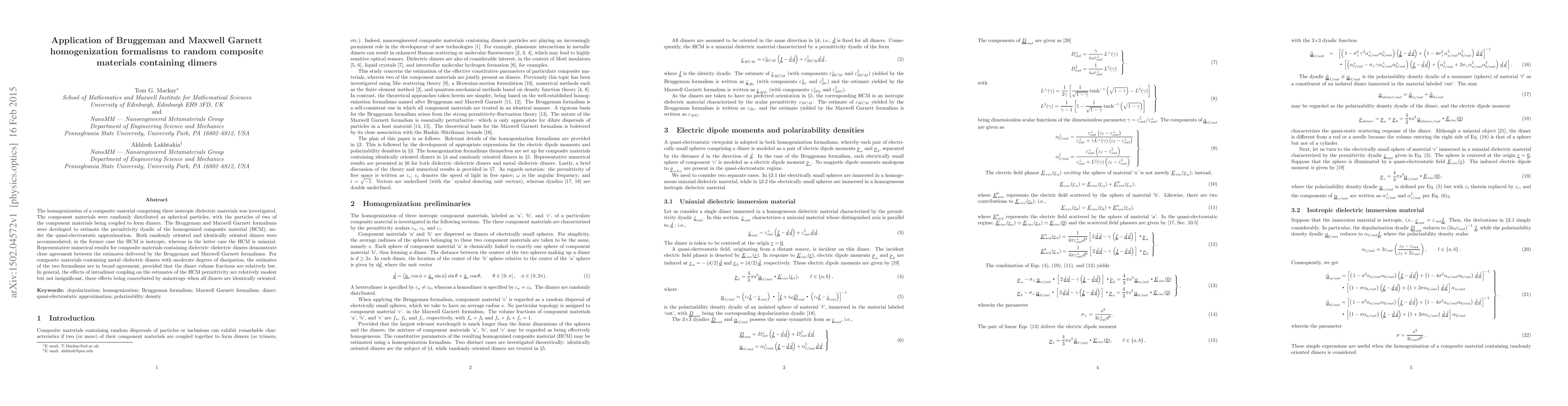This paper investigates the homogenization of random composite materials with three isotropic dielectric components, where two components form dimers. The Bruggeman and Maxwell Garnett formalisms are used to estimate the homogenized composite material's permittivity dyadic, showing close agreement between the two methods, especially for low dimer volume fractions and moderate dissipation.