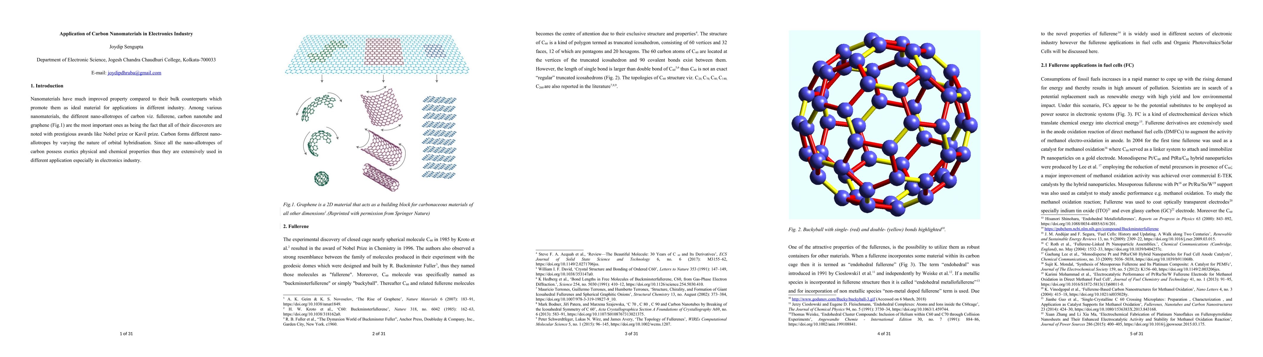 Nanomaterials have much improved properties compared to their bulk counterparts, which promotes them as ideal material for applications in various industries. Among the various nanomaterials, different nanoallotropes of carbon, namely fullerene, carbon nanotubes, and graphene, are the most important as indicated by the fact that their discoverers gained prestigious awards such as Nobel Prize or Kavli Prize. Carbon forms different nano-allotropes by varying the nature of orbital hybridization. Since all nanoallotropes of carbon possess exotic physical and chemical properties, they are extensively used in different applications, especially in the electronic industry.