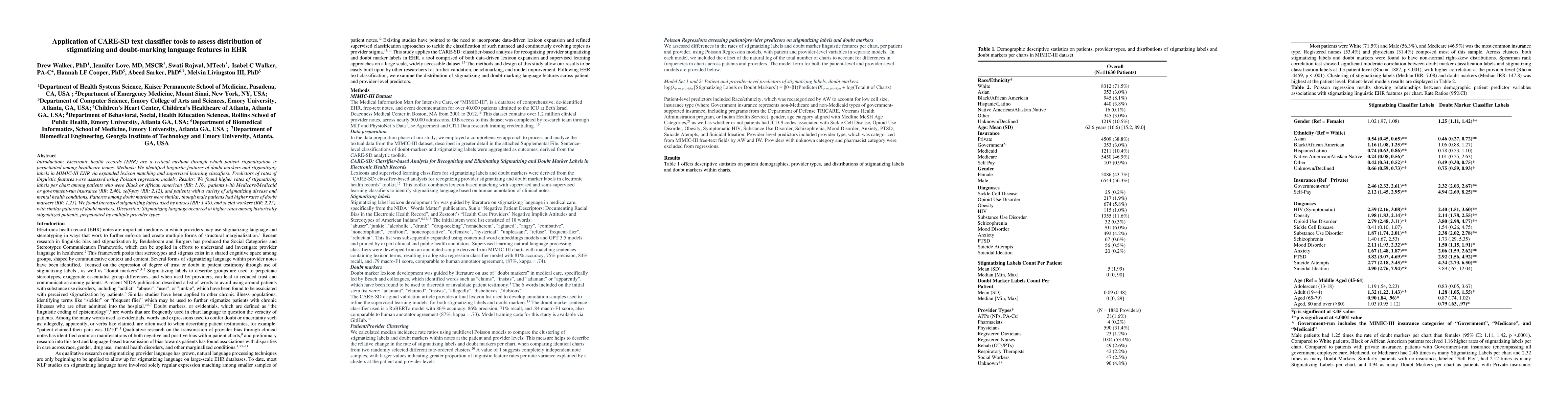Introduction: Electronic health records (EHR) are a critical medium through which patient stigmatization is perpetuated among healthcare teams. Methods: We identified linguistic features of doubt markers and stigmatizing labels in MIMIC-III EHR via expanded lexicon matching and supervised learning classifiers. Predictors of rates of linguistic features were assessed using Poisson regression models. Results: We found higher rates of stigmatizing labels per chart among patients who were Black or African American (RR: 1.16), patients with Medicare/Medicaid or government-run insurance (RR: 2.46), self-pay (RR: 2.12), and patients with a variety of stigmatizing disease and mental health conditions. Patterns among doubt markers were similar, though male patients had higher rates of doubt markers (RR: 1.25). We found increased stigmatizing labels used by nurses (RR: 1.40), and social workers (RR: 2.25), with similar patterns of doubt markers. Discussion: Stigmatizing language occurred at higher rates among historically stigmatized patients, perpetuated by multiple provider types.