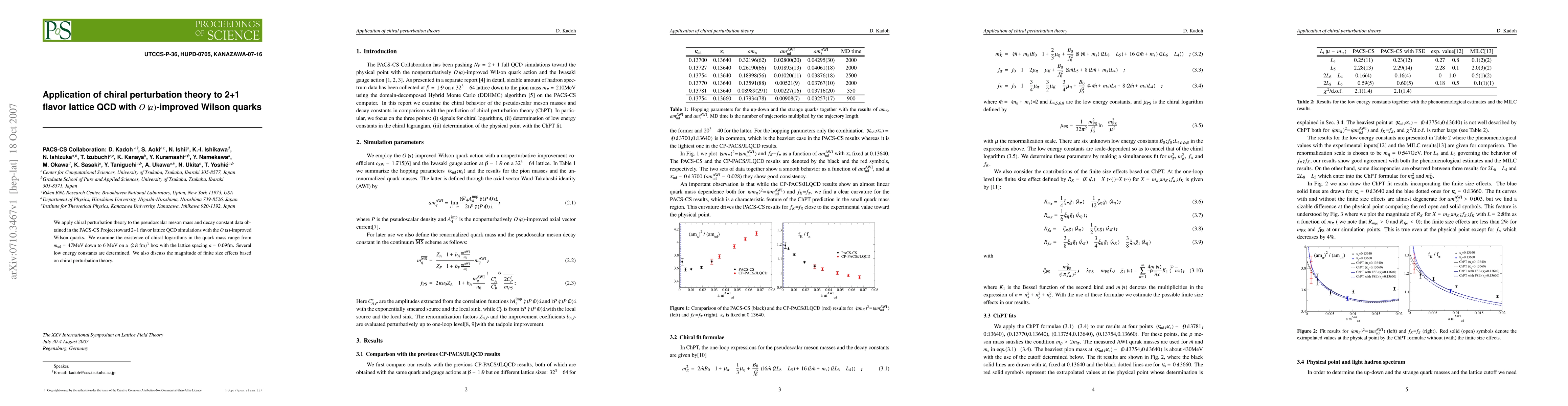 We apply chiral perturbation theory to the pseudoscalar meson mass and decay constant data obtained in the PACS-CS Project toward 2+1 flavor lattice QCD simulations with the O(a)-improved Wilson quarks. We examine the existence of chiral logarithms in the quark mass range from m_{ud}=47 MeV down to 6 MeV on a (2.8 fm)^3 box with the lattice spacing a=0.09 fm. Several low energy constants are determined. We also discuss the magnitude of finite size effects based on chiral perturbation theory.