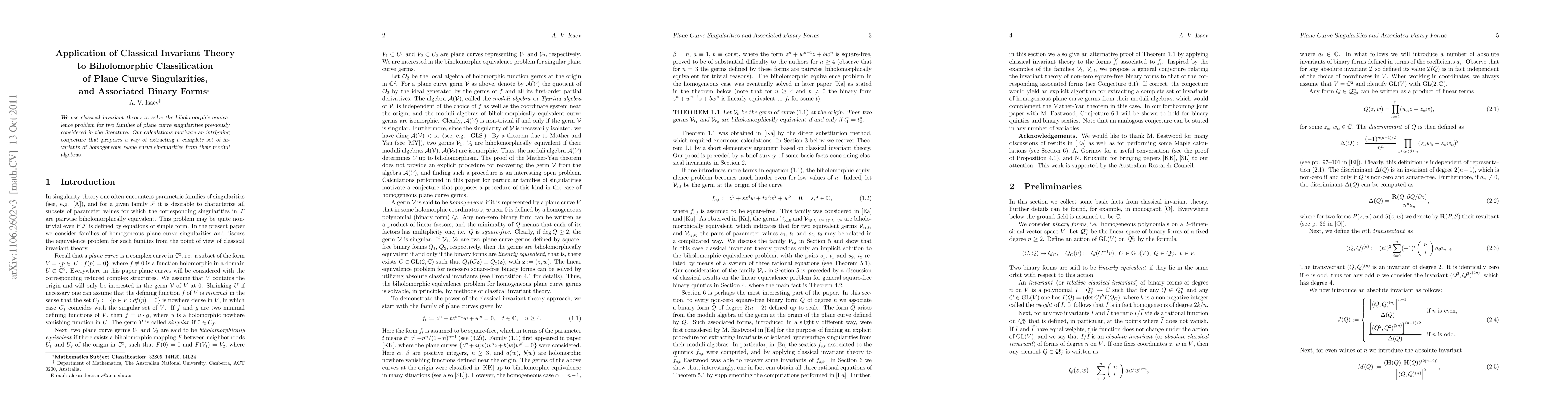Summary: This paper applies classical invariant theory to classify biholomorphic plane curve singularities, proposing a conjecture for deriving a complete set of invariants from their moduli algebras. The method is demonstrated through calculations on two specific families of singularities.