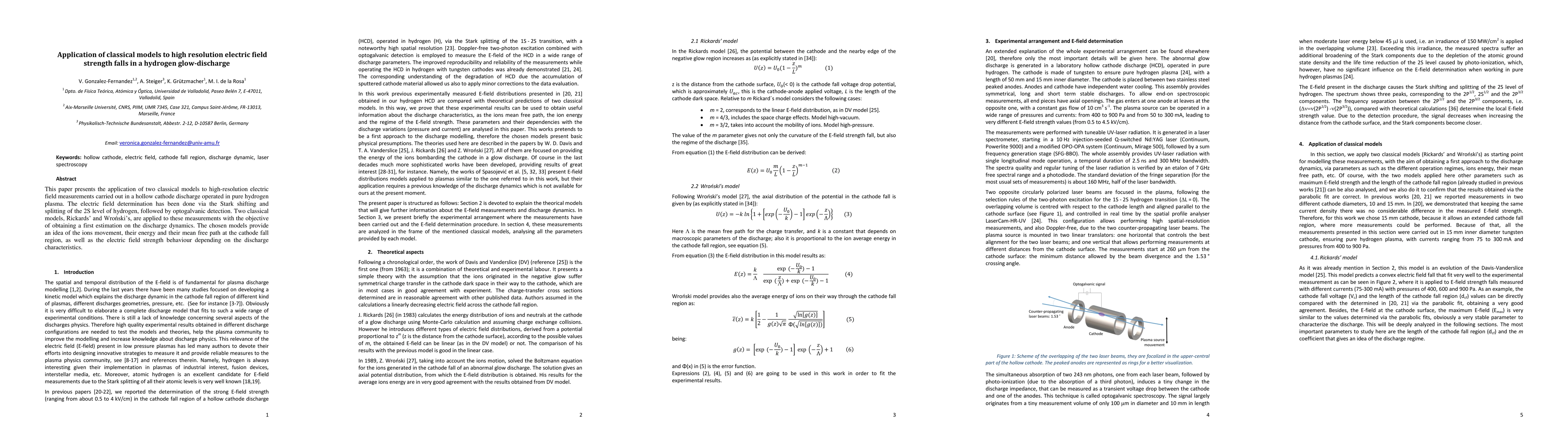 This paper presents the application of two classical models to high-resolution electric field measurements carried out in a hollow cathode discharge operated in pure hydrogen plasma. The electric field determination has been done via the Stark shifting and splitting of the 2S level of hydrogen, followed by optogalvanic detection. Two classical models, Rickards' and Wro{\'n}ski's, are applied to these measurements with the objective of obtaining a first estimation on the discharge dynamics. The chosen models provide an idea of the ions movement, their energy and their mean free path at the cathode fall region, as well as the electric field strength behaviour depending on the discharge characteristics.