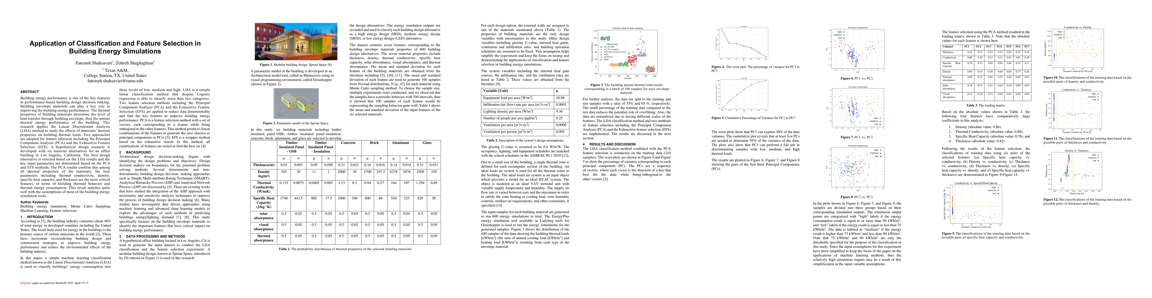 This paper uses Linear Discriminant Analysis (LDA) to evaluate the impact of building materials' thermal properties on building energy performance. The study employs PCA and EFS for feature selection, identifying thermal conductivity, density, specific heat capacity, and thickness as the most critical parameters influencing thermal energy consumption.