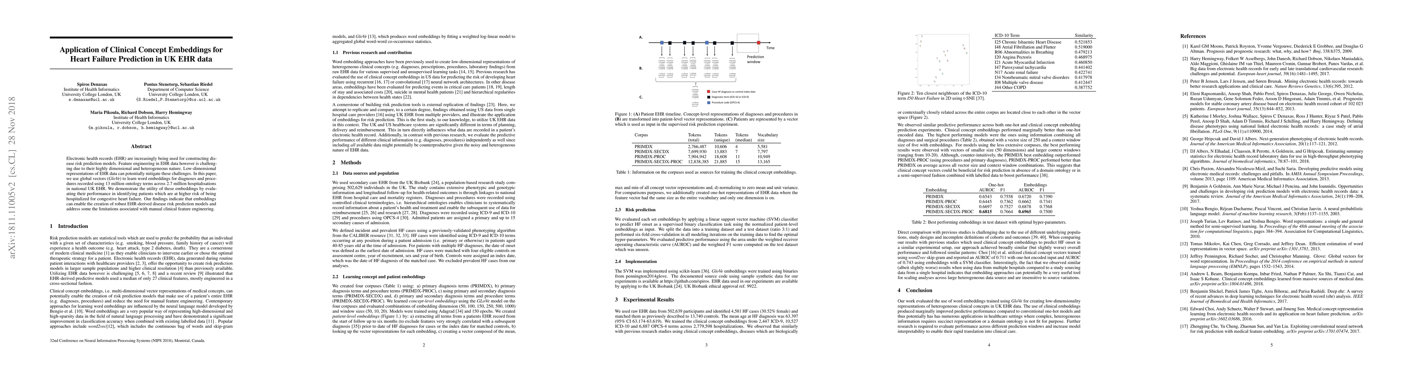 This paper uses clinical concept embeddings derived from UK EHR data to predict heart failure risk, demonstrating that these low-dimensional representations can improve the robustness of disease risk prediction models over traditional feature engineering methods. The study shows promising results in identifying patients at higher risk of congestive heart failure using these embeddings.