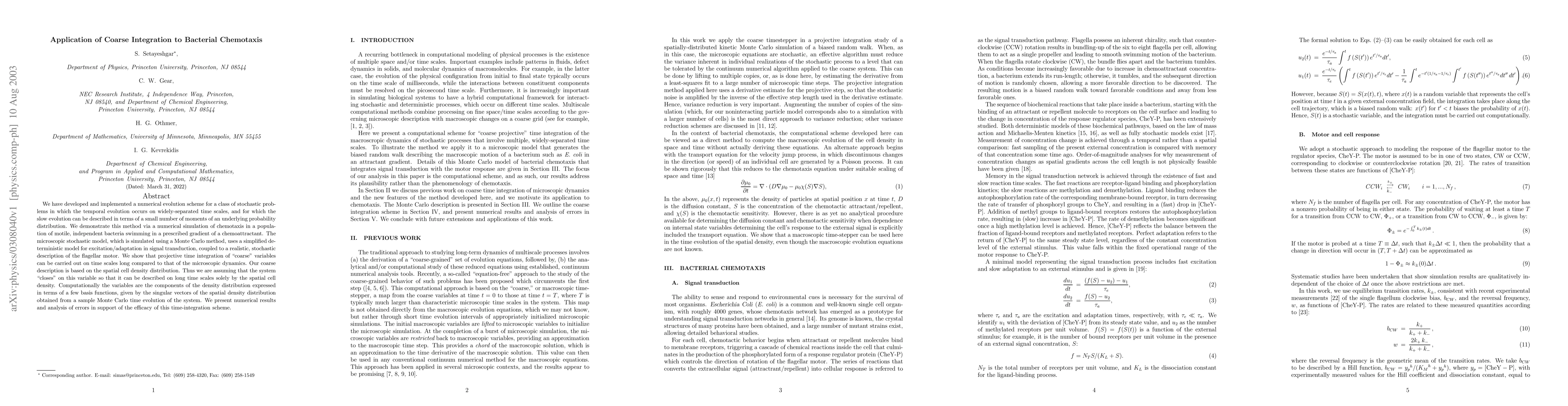 We have developed and implemented a numerical evolution scheme for a class of stochastic problems in which the temporal evolution occurs on widely-separated time scales, and for which the slow evolution can be described in terms of a small number of moments of an underlying probability distribution. We demonstrate this method via a numerical simulation of chemotaxis in a population of motile, independent bacteria swimming in a prescribed gradient of a chemoattractant. The microscopic stochastic model, which is simulated using a Monte Carlo method, uses a simplified deterministic model for excitation/adaptation in signal transduction, coupled to a realistic, stochastic description of the flagellar motor. We show that projective time integration of ``coarse'' variables can be carried out on time scales long compared to that of the microscopic dynamics. Our coarse description is based on the spatial cell density distribution. Thus we are assuming that the system ``closes'' on this variable so that it can be described on long time scales solely by the spatial cell density. Computationally the variables are the components of the density distribution expressed in terms of a few basis functions, given by the singular vectors of the spatial density distribution obtained from a sample Monte Carlo time evolution of the system. We present numerical results and analysis of errors in support of the efficacy of this time-integration scheme.