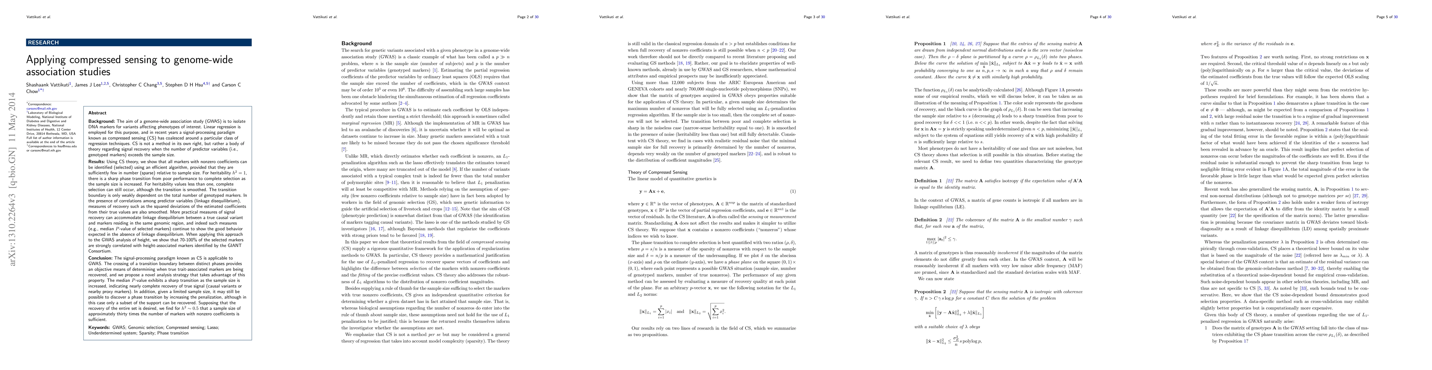 We show that the signal-processing paradigm known as compressed sensing (CS) is applicable to genome-wide association studies (GWAS) and genomic selection (GS). The aim of GWAS is to isolate trait-associated loci, whereas GS attempts to predict the phenotypic values of new individuals on the basis of training data. CS addresses a problem common to both endeavors, namely that the number of genotyped markers often greatly exceeds the sample size. We show using CS methods and theory that all loci of nonzero effect can be identified (selected) using an efficient algorithm, provided that they are sufficiently few in number (sparse) relative to sample size. For heritability h2 = 1, there is a sharp phase transition to complete selection as the sample size is increased. For heritability values less than one, complete selection can still occur although the transition is smoothed. The transition boundary is only weakly dependent on the total number of genotyped markers. The crossing of a transition boundary provides an objective means to determine when true effects are being recovered; we discuss practical methods for detecting the boundary. For h2 = 0.5, we find that a sample size that is thirty times the number of nonzero loci is sufficient for good recovery.
