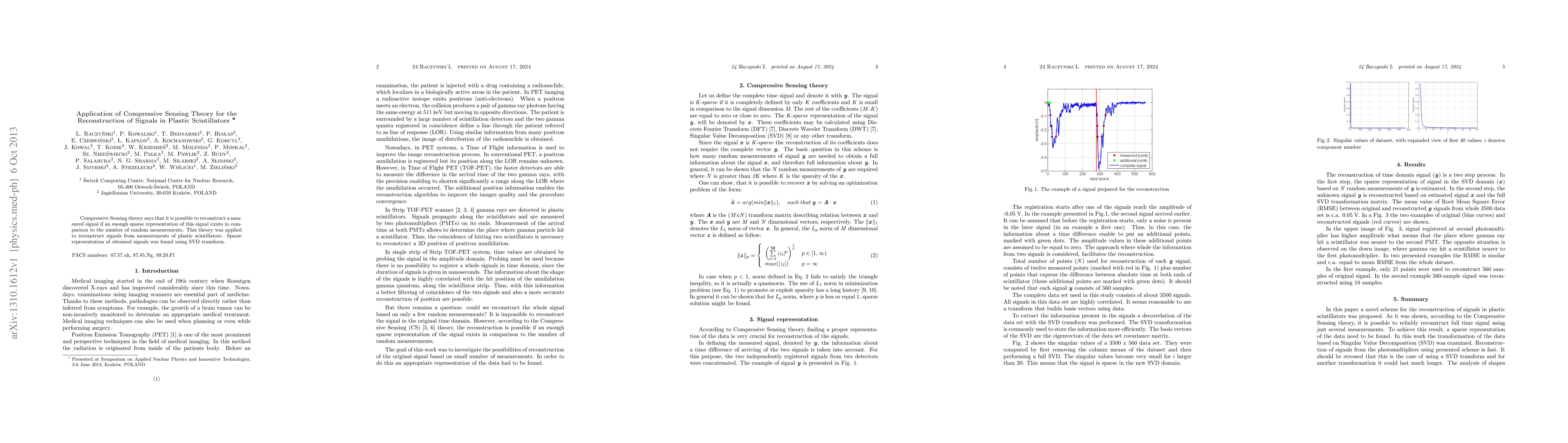 Summary: This paper applies Compressive Sensing theory to reconstruct signals from plastic scintillators using sparse representations identified via SVD transform, demonstrating the feasibility of reconstructing signals with fewer measurements than traditional methods.