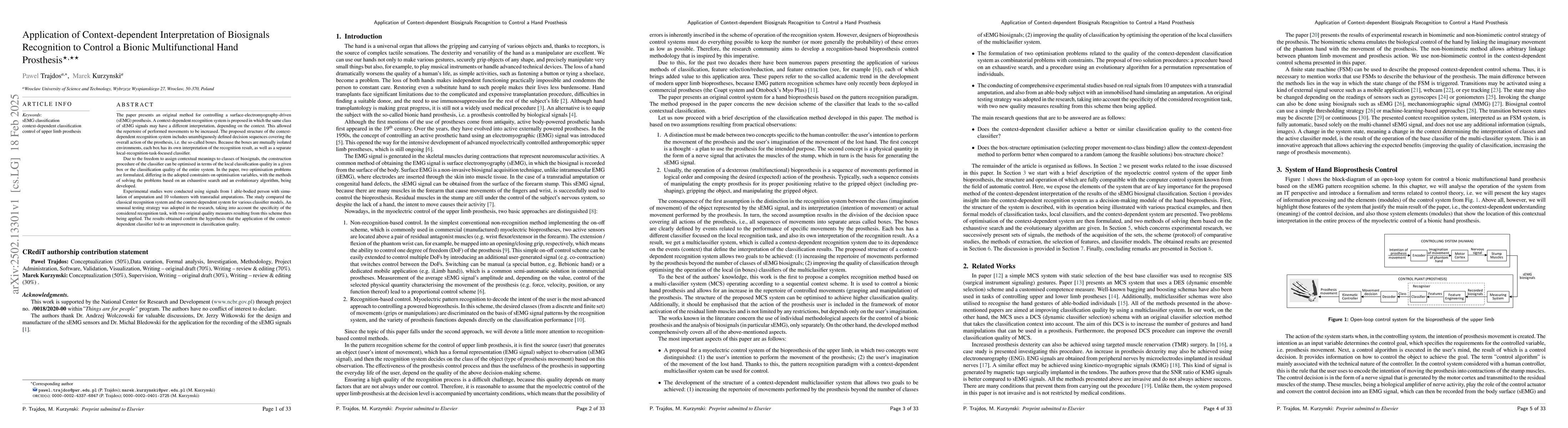 The paper presents an innovative context-dependent recognition system for sEMG-driven prosthetic control, incorporating a modular structure with isolated 'boxes' for local classification, each with its own interpretation of recognition results, and optimization methods to enhance classification quality.