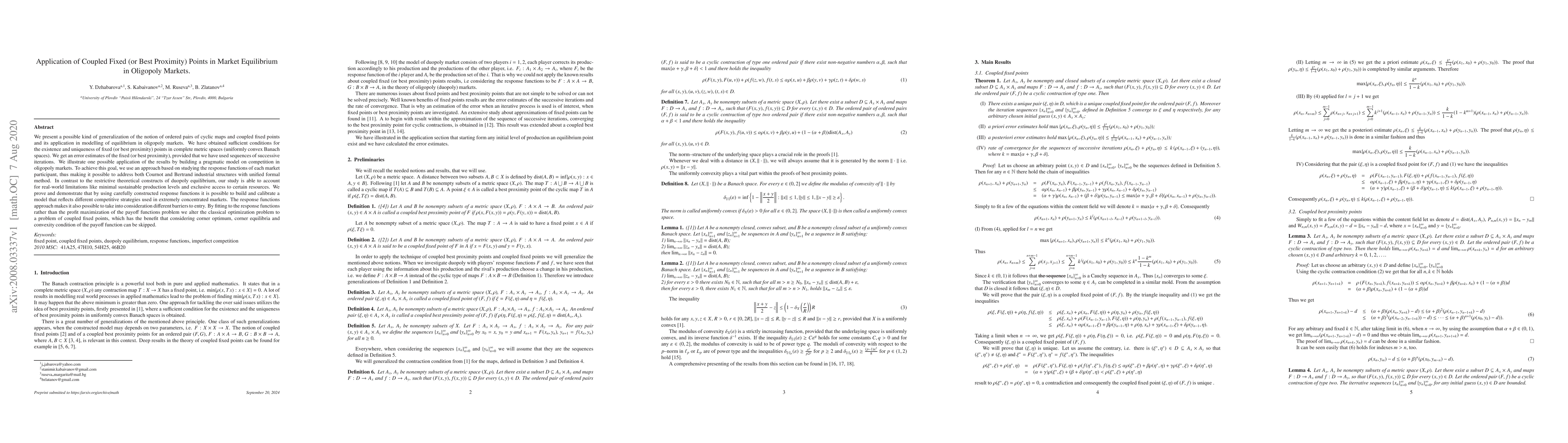We present a possible kind of generalization of the notion of ordered pairs of cyclic maps and coupled fixed points and its application in modelling of equilibrium in oligopoly markets. We have obtained sufficient conditions for the existence and uniqueness of fixed (or best proximity) points in complete metric spaces (uniformly convex Banach spaces). We get an error estimates of the fixed (or best proximity), provided that we have used sequences of successive iterations. We illustrate one possible application of the results by building a pragmatic model on competition in oligopoly markets. To achieve this goal, we use an approach based on studying the response functions of each market participant, thus making it possible to address both Cournot and Bertrand industrial structures with unified formal method. In contrast to the restrictive theoretical constructs of duopoly equilibrium, our study is able to account for real-world limitations like minimal sustainable production levels and exclusive access to certain resources. We prove and demonstrate that by using carefully constructed response functions it is possible to build and calibrate a model that reflects different competitive strategies used in extremely concentrated markets. The response functions approach makes it also possible to take into consideration different barriers to entry. By fitting to the response functions rather than the profit maximization of the payoff functions problem we alter the classical optimization problem to a problem of coupled fixed points, which has the benefit that considering corner optimum, corner equilibria and convexity condition of the payoff function can be skipped.