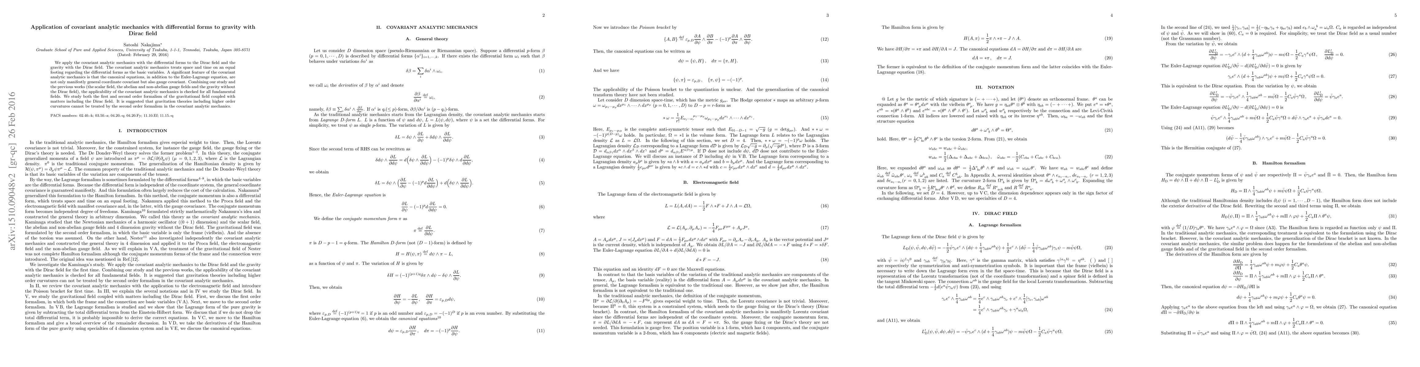 This paper applies covariant analytic mechanics with differential forms to gravity coupled with a Dirac field, showing that this framework treats space and time equally and retains both general coordinate and gauge covariance in canonical equations. The study confirms the method’s applicability to fundamental fields and explores both first and second-order formalisms for gravitational fields, suggesting higher-order curvatures cannot be treated in the second-order formalism.