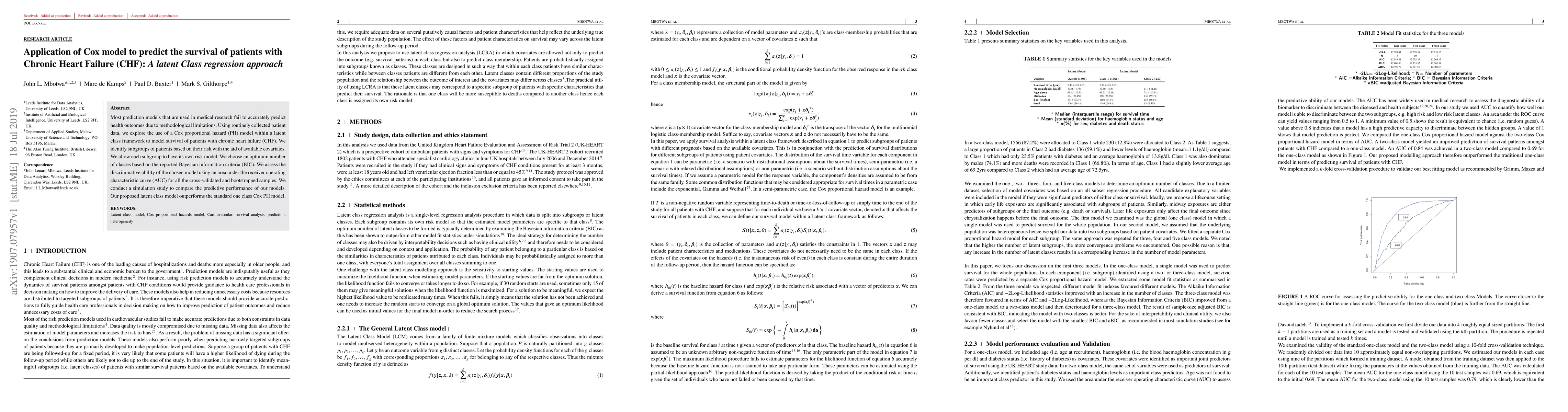 Most prediction models that are used in medical research fail to accurately predict health outcomes due to methodological limitations. Using routinely collected patient data, we explore the use of a Cox proportional hazard (PH) model within a latent class framework to model survival of patients with chronic heart failure (CHF). We identify subgroups of patients based on their risk with the aid of available covariates. We allow each subgroup to have its own risk model.We choose an optimum number of classes based on the reported Bayesian information criteria (BIC). We assess the discriminative ability of the chosen model using an area under the receiver operating characteristic curve (AUC) for all the cross-validated and bootstrapped samples.We conduct a simulation study to compare the predictive performance of our models. Our proposed latent class model outperforms the standard one class Cox PH model.