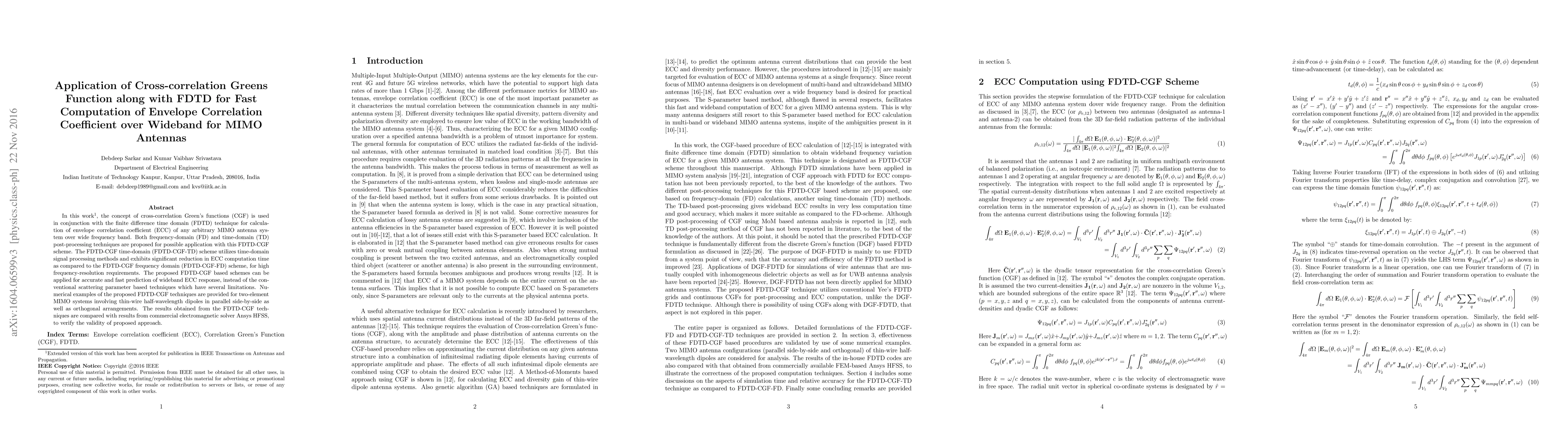 In this paper, the concept of cross-correlation Green's functions (CGF) is used in conjunction with the finite difference time domain (FDTD) technique for calculation of envelope correlation coefficient (ECC) of any arbitrary MIMO antenna system over wide frequency band. Both frequency-domain (FD) and time-domain (TD) post-processing techniques are proposed for possible application with this FDTD-CGF scheme. The FDTD-CGF time-domain (FDTD-CGF-TD) scheme utilizes time-domain signal processing methods and exhibits significant reduction in ECC computation time as compared to the FDTD-CGF frequency domain (FDTD-CGF-FD) scheme, for high frequency-resolution requirements. The proposed FDTD-CGF based schemes can be applied for accurate and fast prediction of wideband ECC response, instead of the conventional scattering parameter based techniques which have several limitations. Numerical examples of the proposed FDTD-CGF techniques are provided for two-element MIMO systems involving thin-wire half-wavelength dipoles in parallel side-by-side as well as orthogonal arrangements. The results obtained from the FDTD-CGF techniques are compared with results from commercial electromagnetic solver Ansys HFSS, to verify the validity of proposed approach.