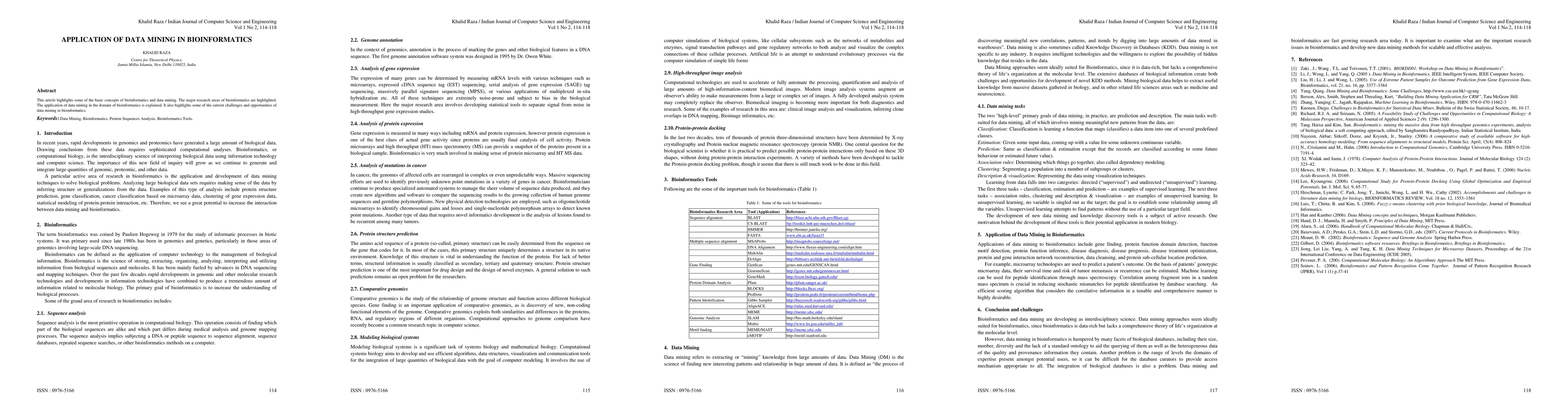 The paper discusses the application of data mining in bioinformatics, focusing on various research areas such as genome annotation, gene and protein expression analysis, mutation analysis in cancer, protein structure prediction, comparative genomics, modeling biological systems, high-throughput image analysis, protein-protein docking, and bioinformatics tools.