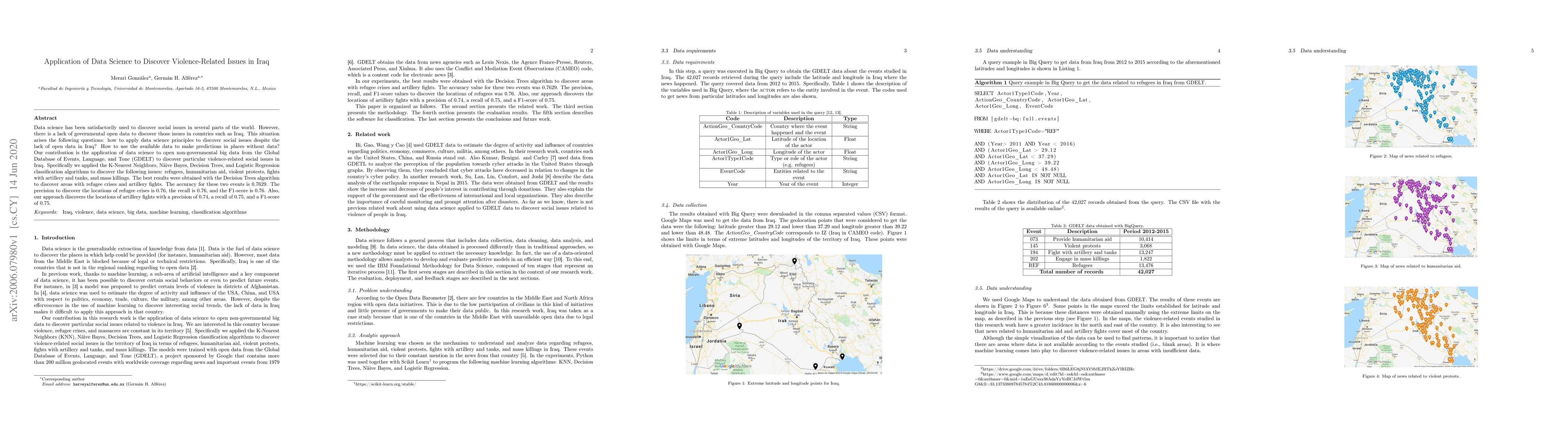 A study applied data science to analyze non-governmental big data from Iraq, discovering violence-related social issues such as refugee crises and artillery fights with high accuracy using Decision Trees algorithm.