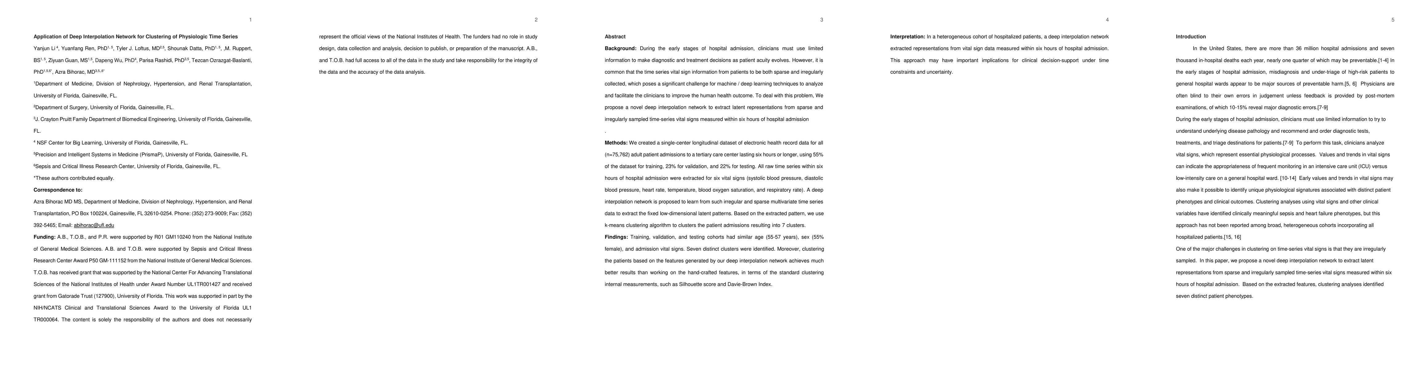 This paper proposes a deep interpolation network to extract latent representations from sparse and irregularly sampled vital sign time series data within six hours of hospital admission. The network successfully clusters patient admissions into seven distinct groups, suggesting potential for clinical decision-support in time-constrained environments.