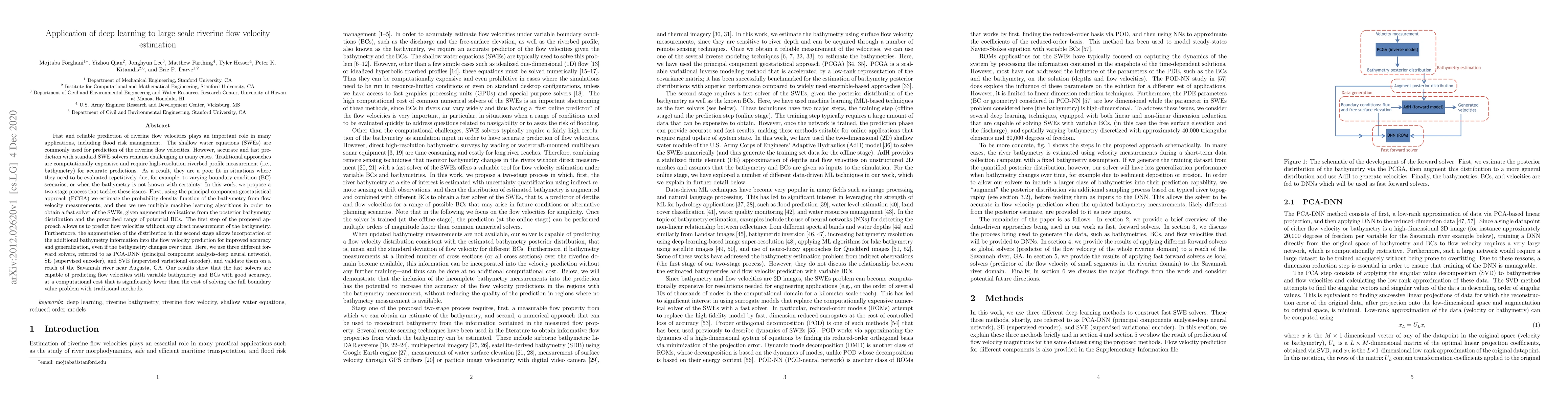 This research introduces a two-stage method using deep learning for estimating riverine flow velocities. It combines principal component geostatistical approach (PCGA) to infer bathymetry from flow velocity measurements and machine learning algorithms (PCA-DNN, SE, SVE) to quickly solve shallow water equations. The method significantly reduces computational cost while maintaining accuracy, proven effective on the Savannah river near Augusta, GA.