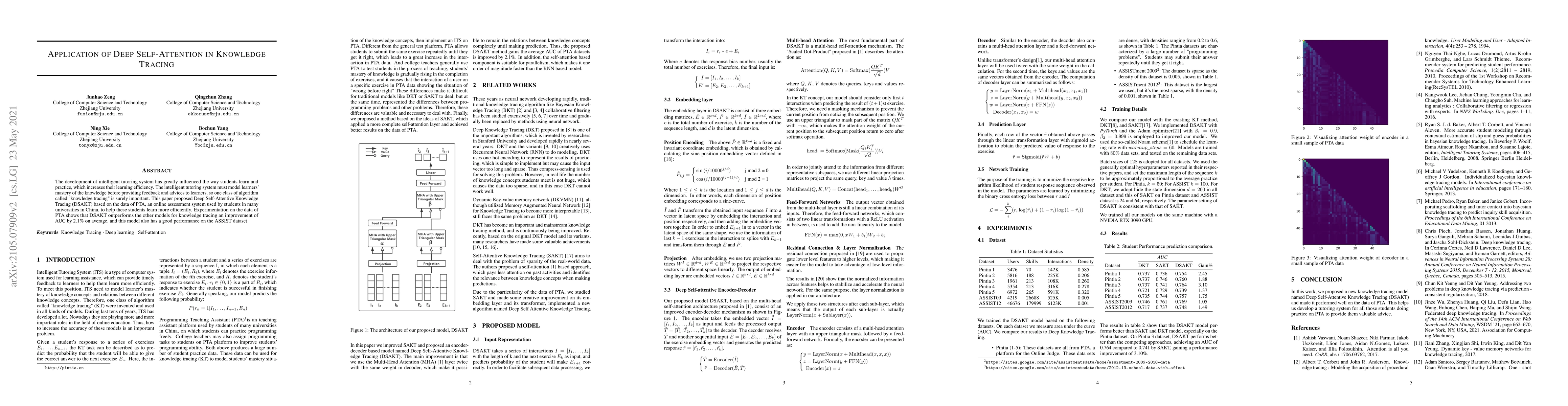 This paper proposes Deep Self-Attentive Knowledge Tracing (DSAKT) to improve intelligent tutoring systems by better modeling students' learning progress. Experiments on PTA and ASSIST datasets show DSAKT outperforms other models, achieving a 2.1% improvement in AUC on average.