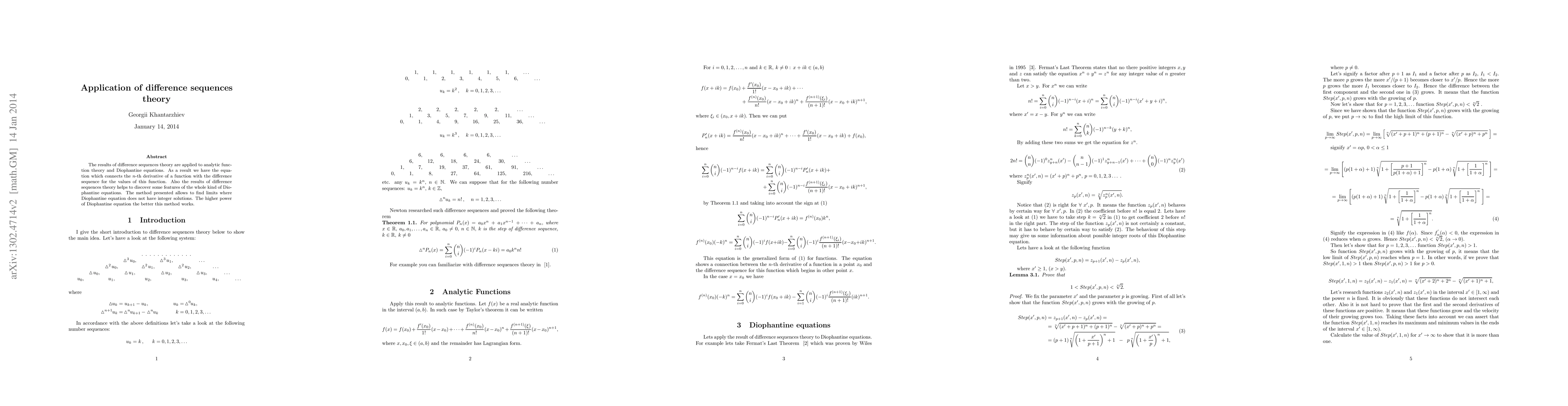 The results of difference sequences theory are applied to analytic function theory and Diophantine equations. As a result we have the equation which connects the $n$-th derivative of a function with the difference sequence for the values of this function. Also the results of difference sequences theory helps to discover some features of the whole kind of Diophantine equations. The method presented allows to find limits where Diophantine equation does not have integer solutions. The higher power of Diophantine equation the better this method works.